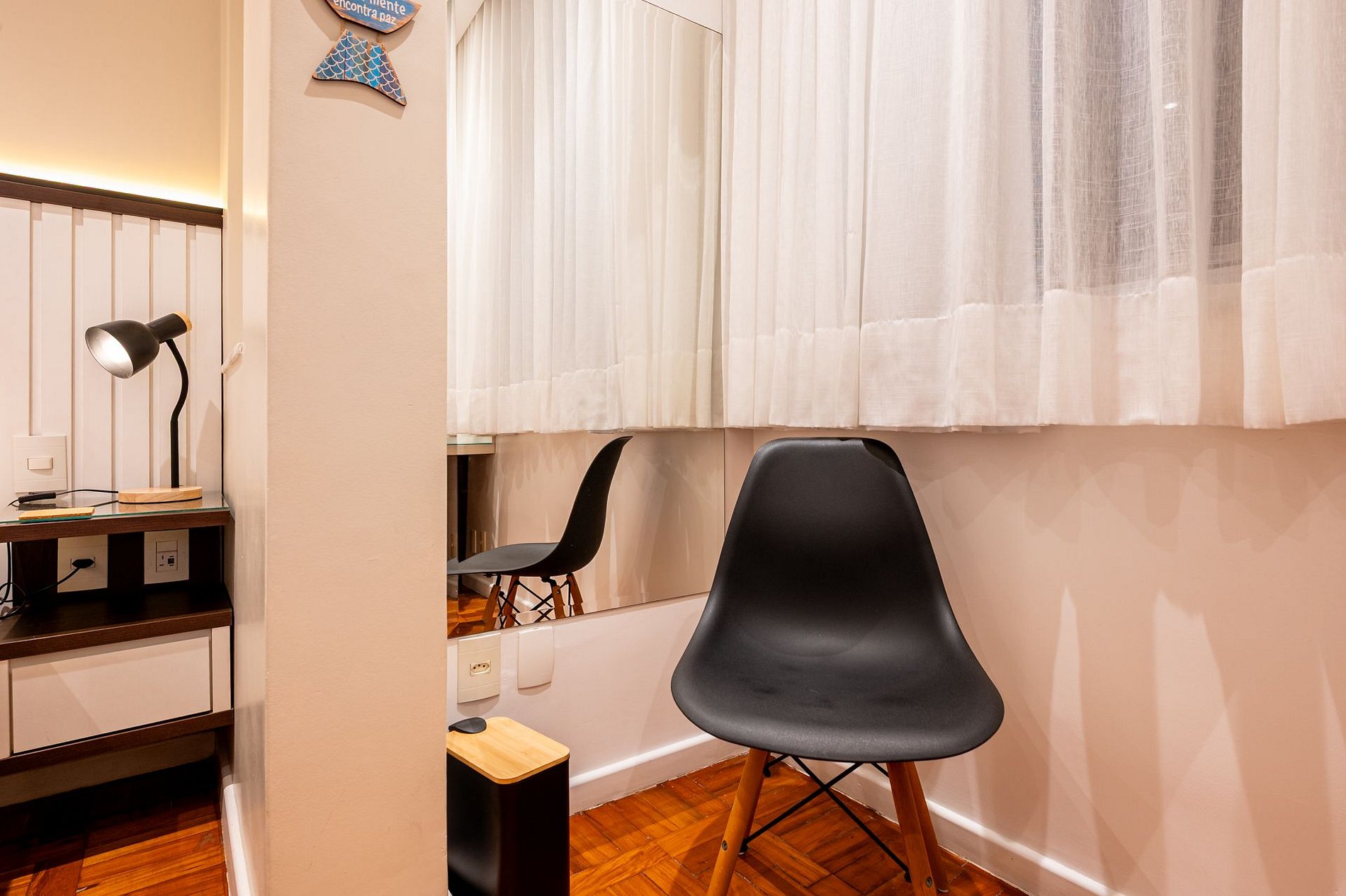 The apartment offers: fast Wi-Fi, smart TV with Netflix and Prime Video, sound system, washer and dryer, iron, drying rack, and a workspace with an ergonomic chair.