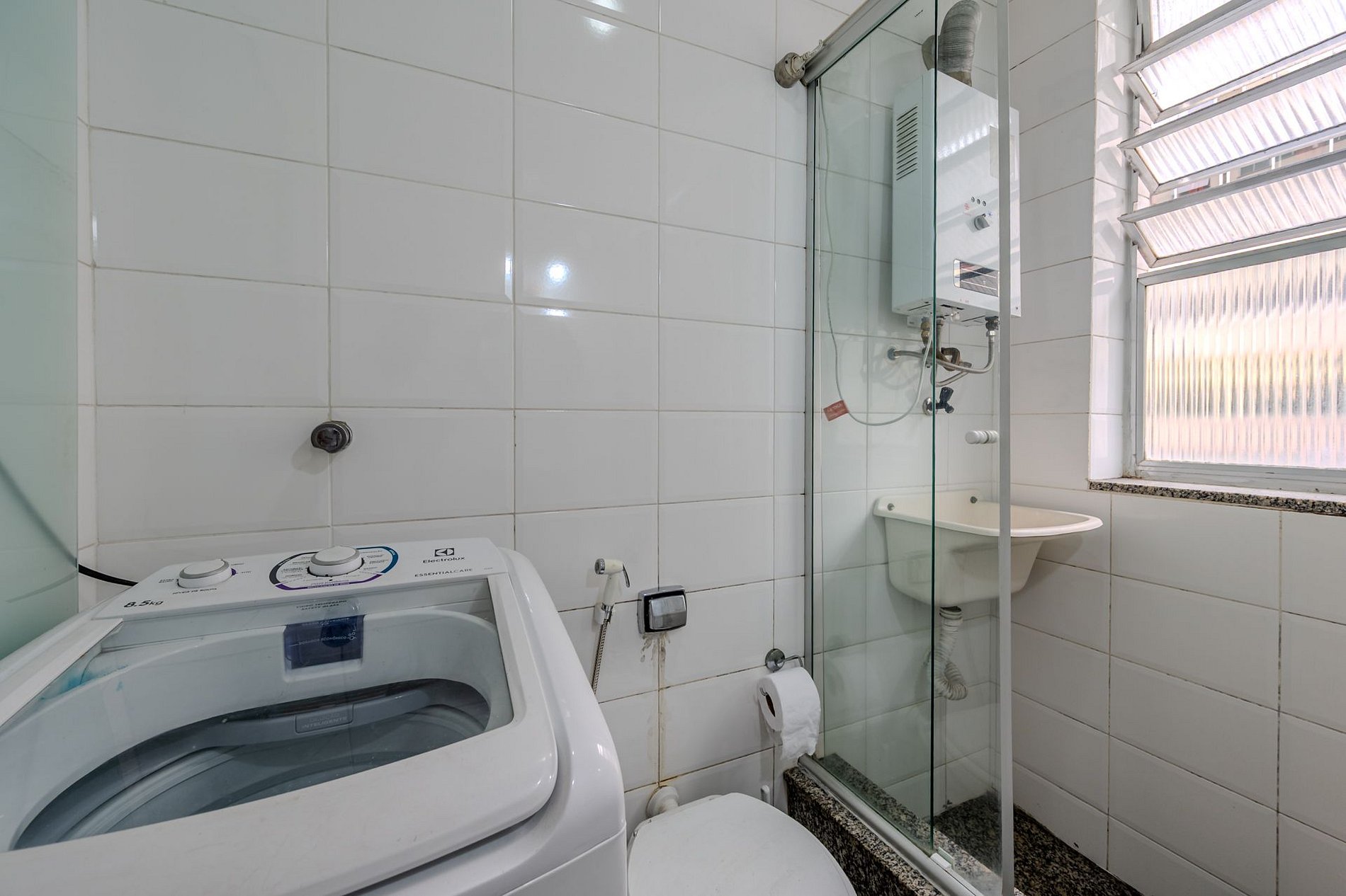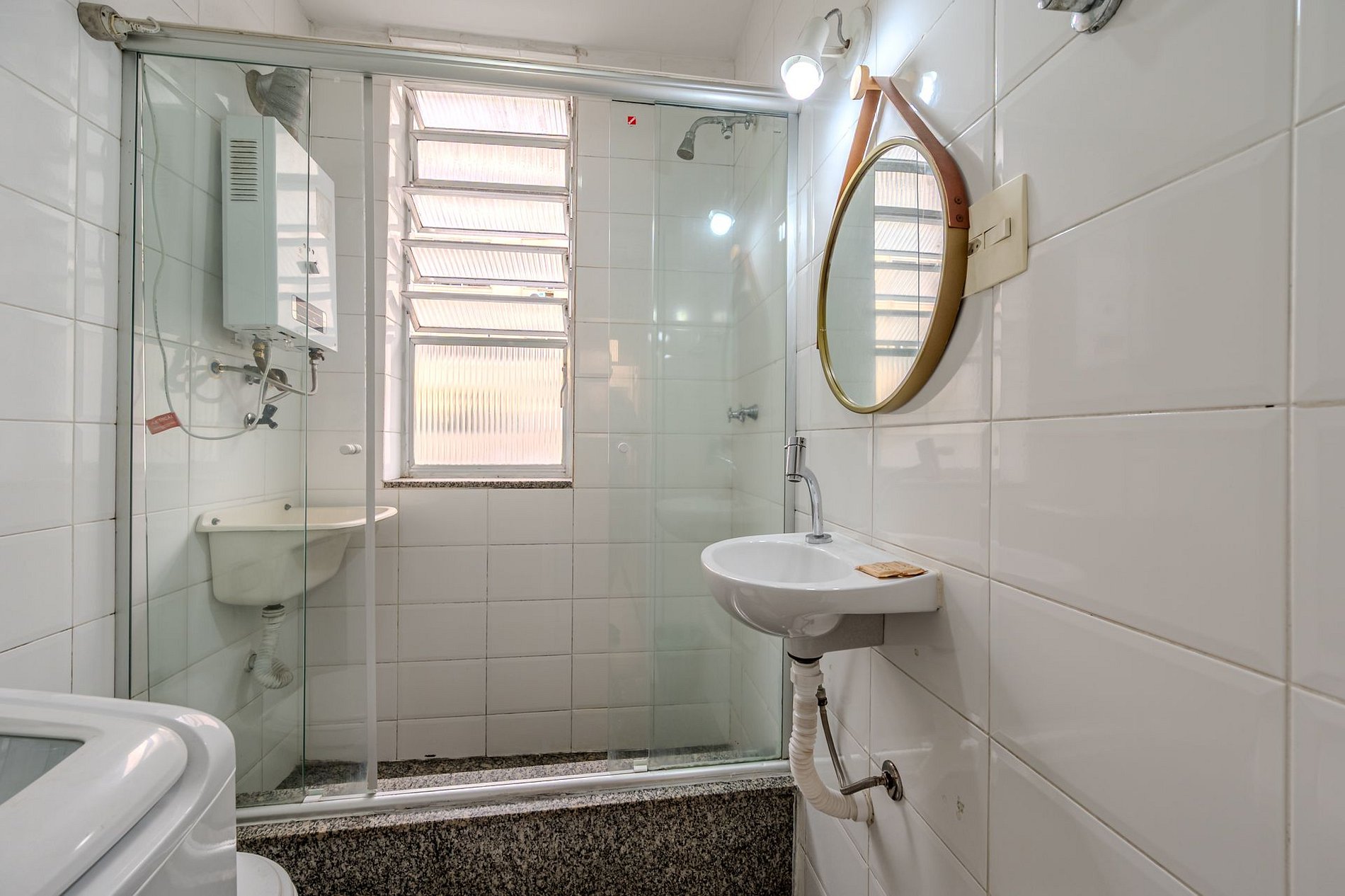 Bathroom: glass shower box, gas-heated shower, and washing machine.