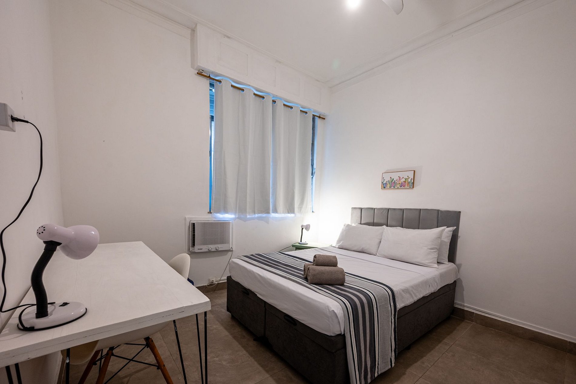 Living room: double sofa bed, work desk, and ceiling fan, plus a portable fan for extra comfort.