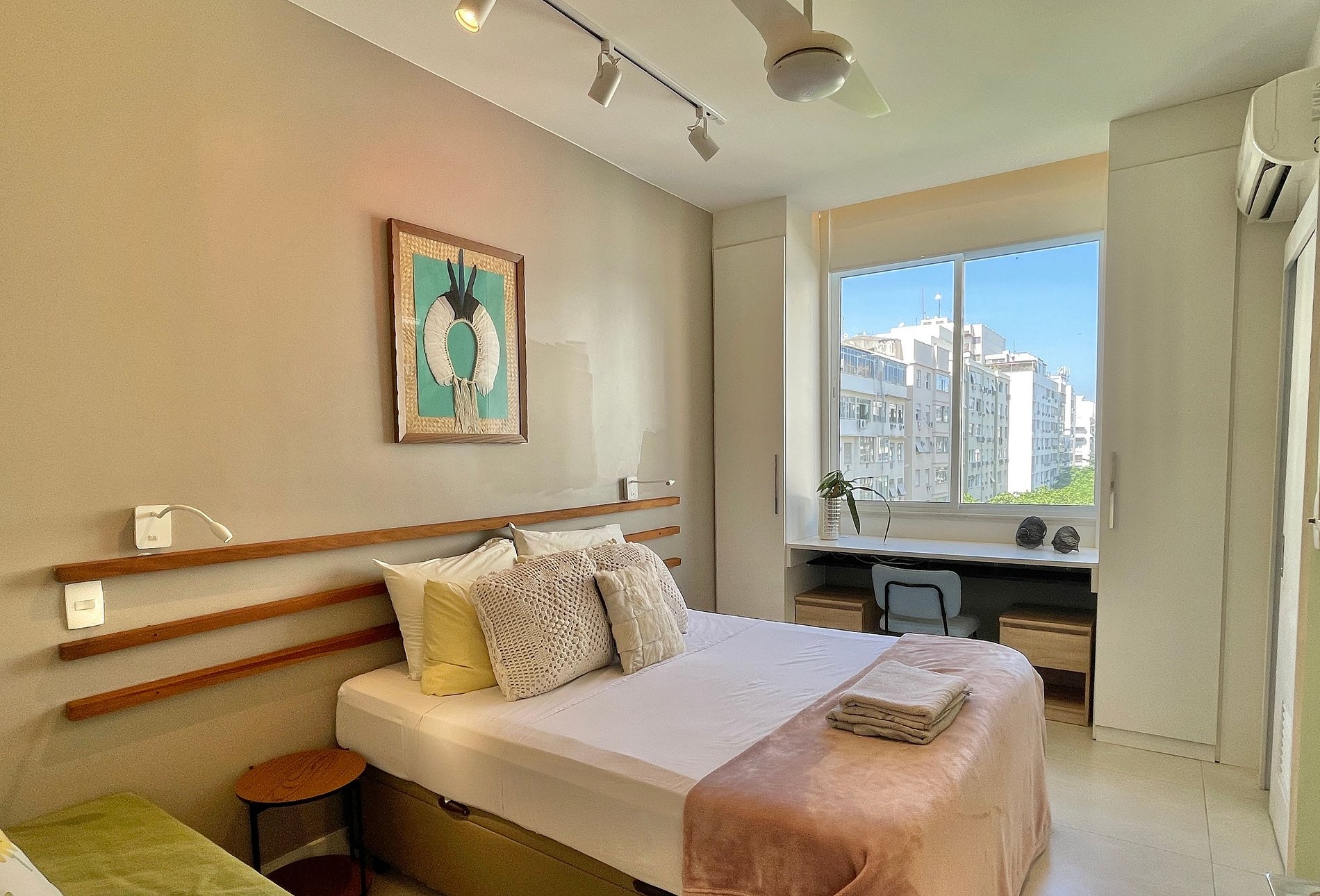 Close to Arpoador Beach, the safest and most beautiful sunset. Make yourself at home here, close to three beaches (Ipanema, Arpoador and Copacabana). Overlooking a square and tree-lined street, the view is a sight for sore eyes and makes your stay more enjoyable. Full kitchen, bedroom with comfortable beds and sofa bed, air conditioning. Located in a prime spot in Rio (next to a hotel), family building, 24-hour concierge and 4 new elevators. NOTE: 1 queen bed OR 2 single beds+1 mini bed (1,50cm x 0,70) +1 sofa bed. 24-hour parking (not included) 8 minutes' walk from the property.