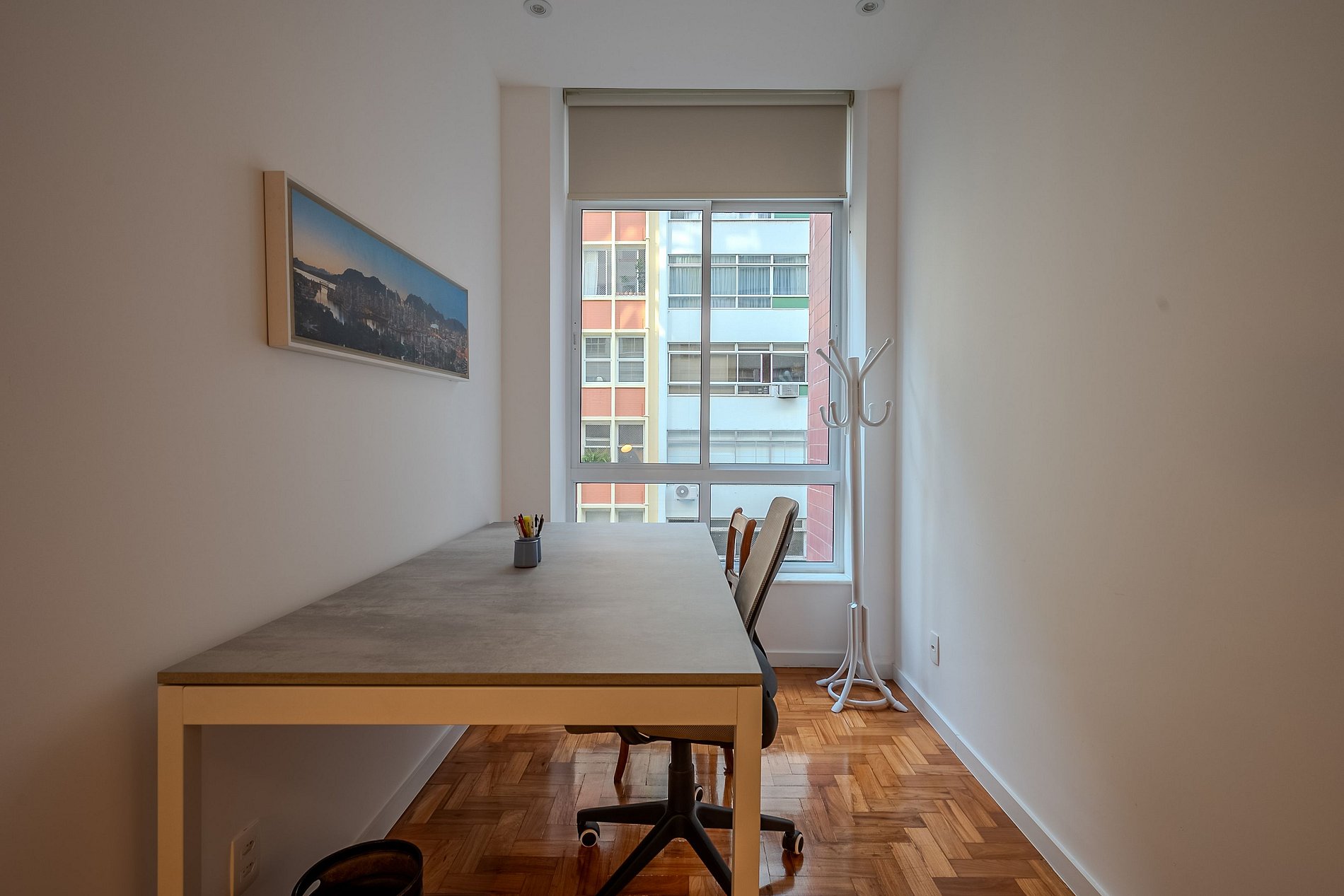 Furnished apartment on Avenida Atlântica, the street of Leme and Copacabana Beach. Spacious living room, three bedrooms (two with Queen beds, one with an en-suite bathroom, another with a working station, and the third with a bed and a single sofa bed, a single bed and a spacious work desk).