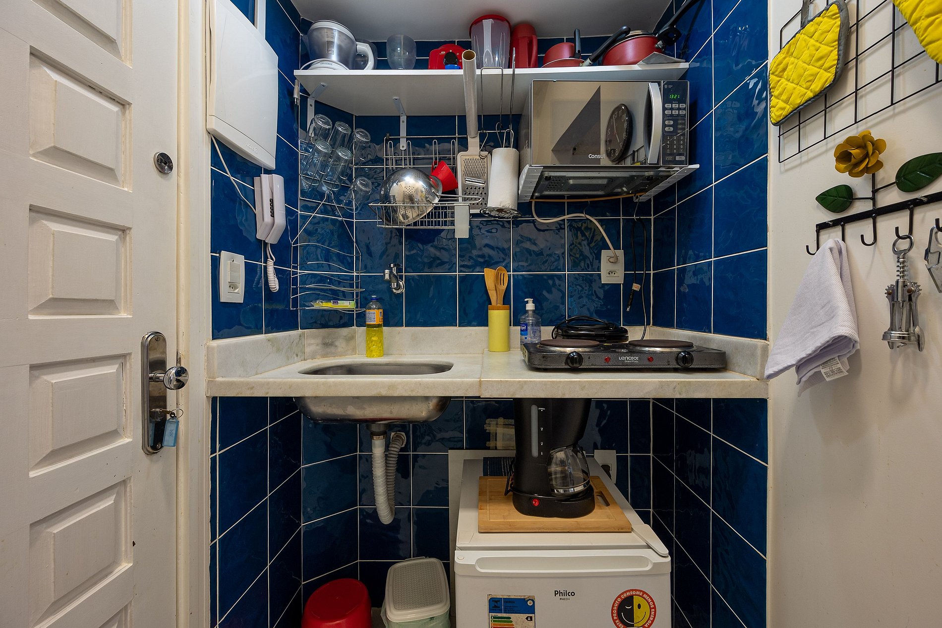 Kitchen with utensils, minibar, double electric cooktop, microwave, water filter and a mini laundry area with washing machine and sink.