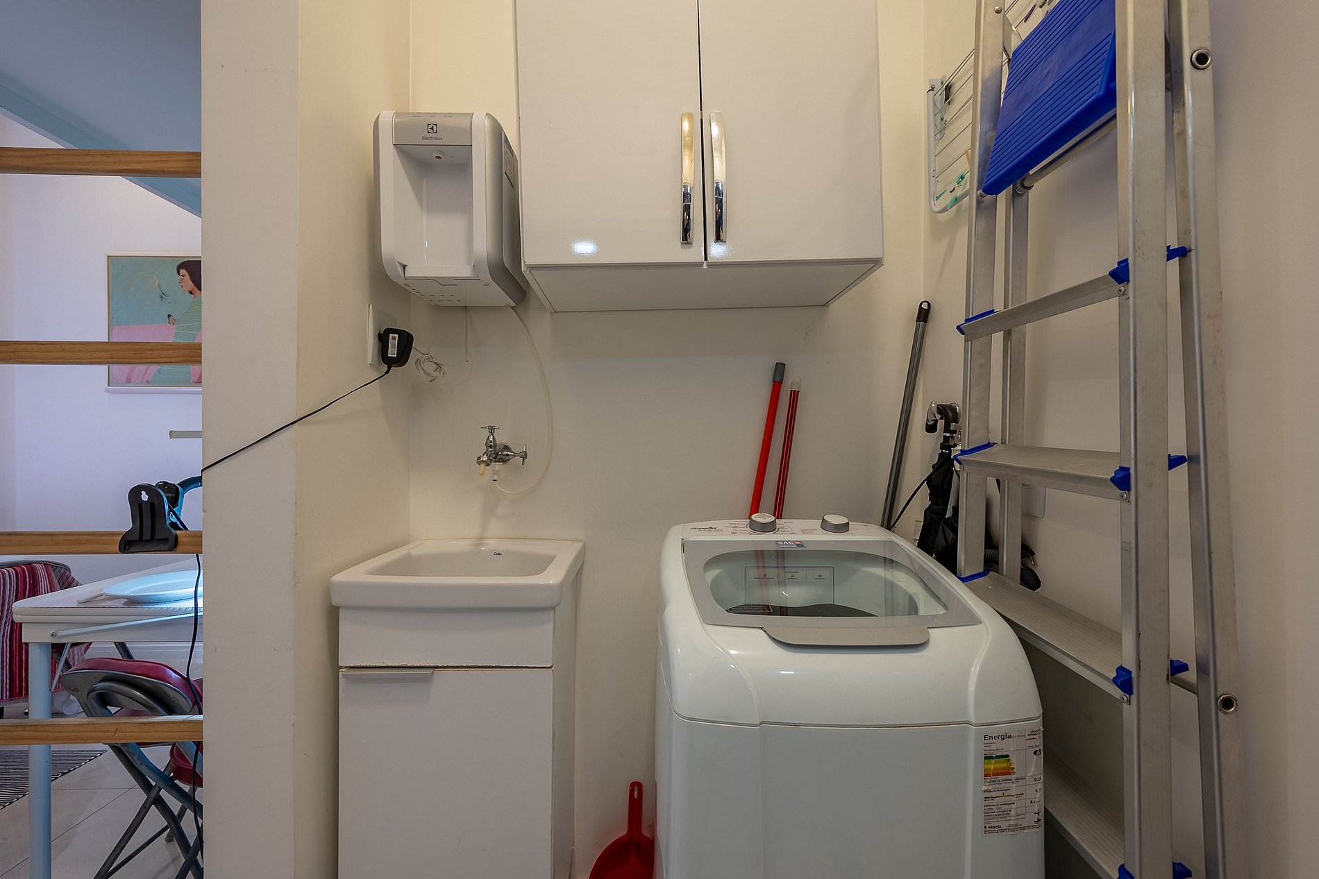 Na cozinha tem um fogão por indução, garrafa de café, panelas, liquidificador, espremedor de laranjas,copo, talheres e pratos, frigobar, filtro, máquina de lavar roupas, microondas, TV a cabo, Ar condicionado.