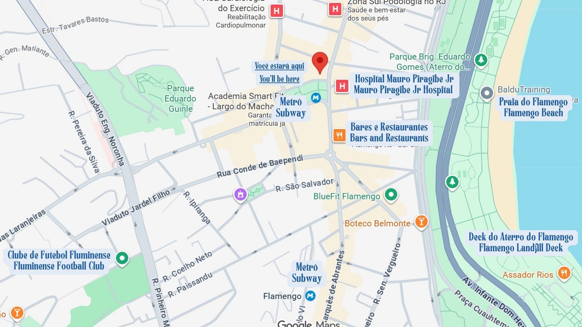 Está a 2 minutos da estação de metrô facilitando a locomoção para os pontos turísticos, gastronômicos e centros de comerciais do RJ. A região é repleta de restaurantes, bares, supermercados, farmácias e galerias. Está a 7 minutos a pé da Praia do Flamengo, recomendo caminhadas no aterro, curtir o nascer do sol com vista para a Baia de Guanabara e o Pão de Açucar.