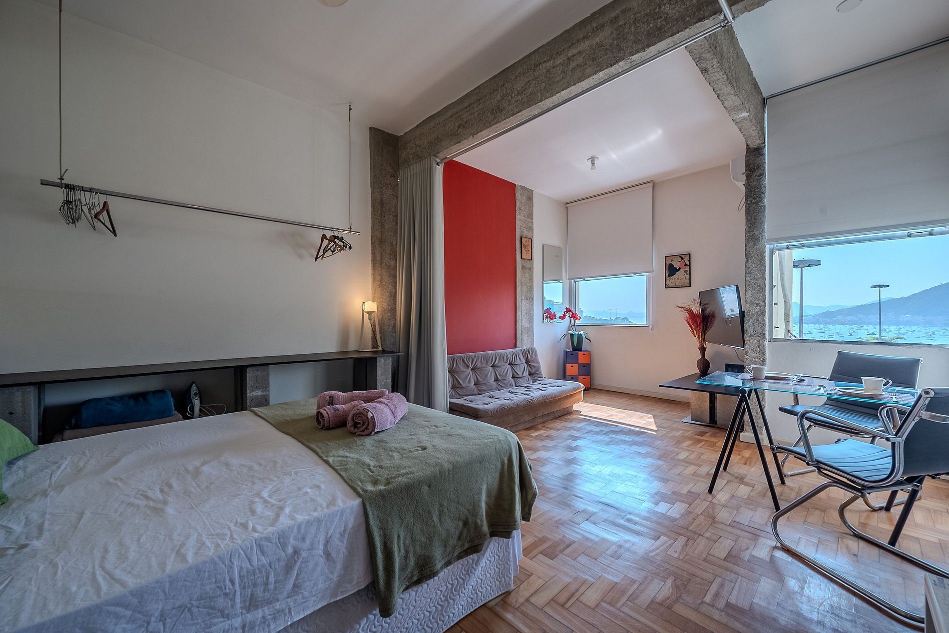 Facing the beach, beautiful view of Sugarloaf Mountain, the space includes a residential garage, double bed in a charming environment, large bathroom, equipped kitchen, laundry area as well as a single bed in a bedroom with bathroom and a sofa bed in the living room. Wifi included. You will love it because of the view, the location and the environment. Excellent for couples, leisure trips, business or family. Next to the subway, shopping mall, restaurants, cinemas and bars.