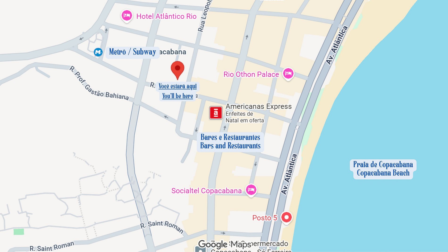 Sugerencias cercanas: orla de Copacabana, Fuerte de Copacabana, Posto 5, Pedra do Arpoador y ferias locales.