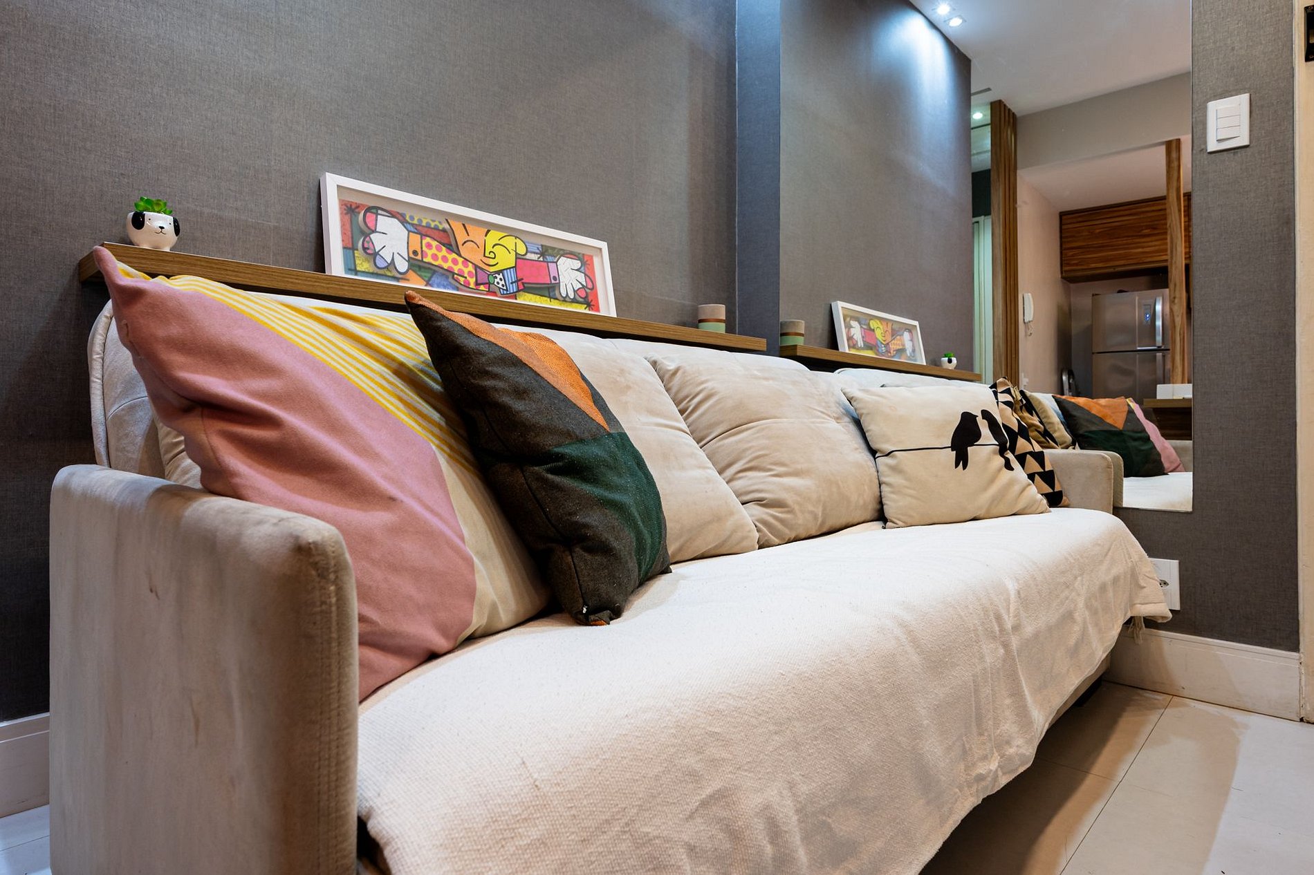 Sala de estar: sofá, TV y escritorio para home office.