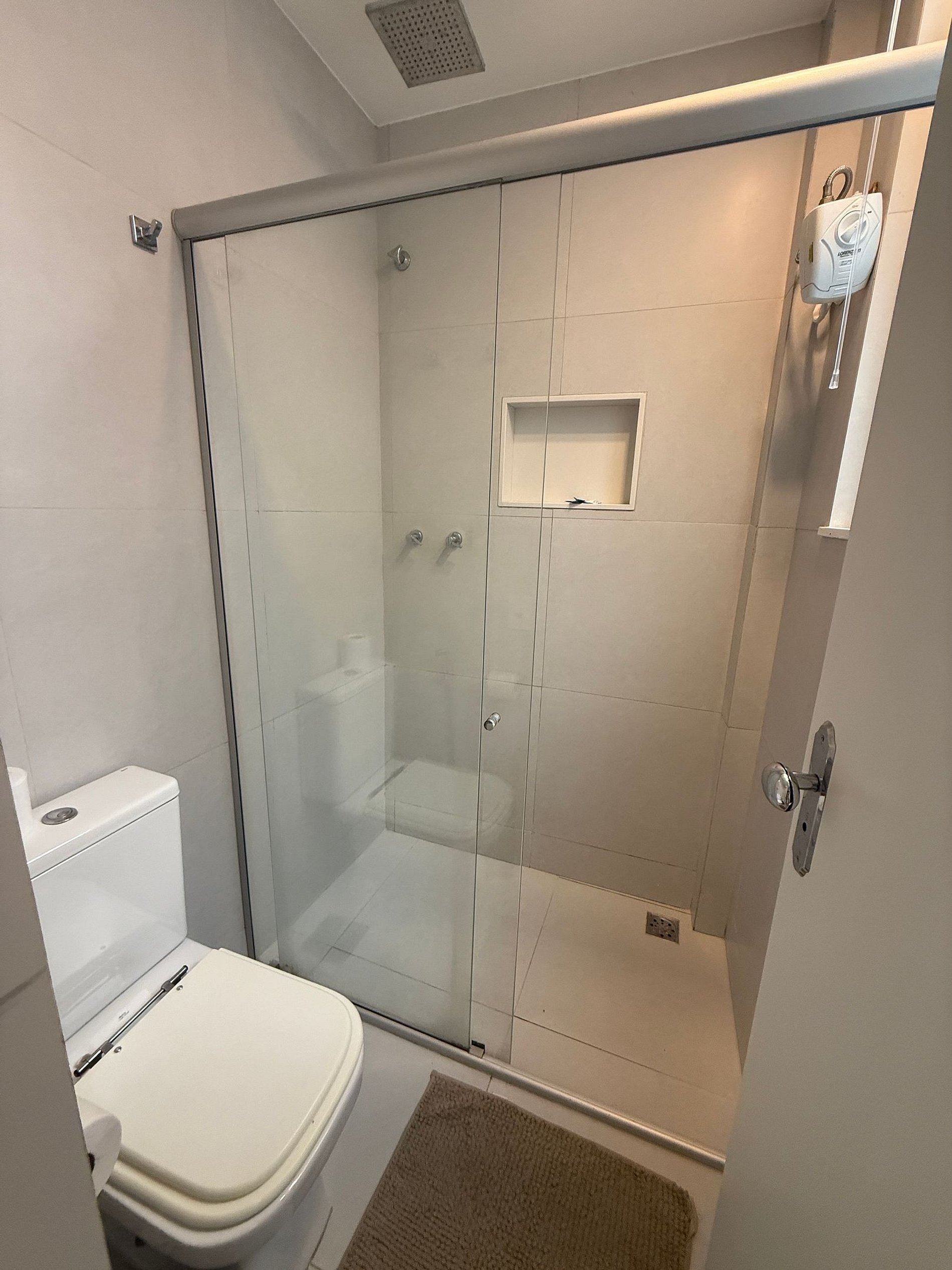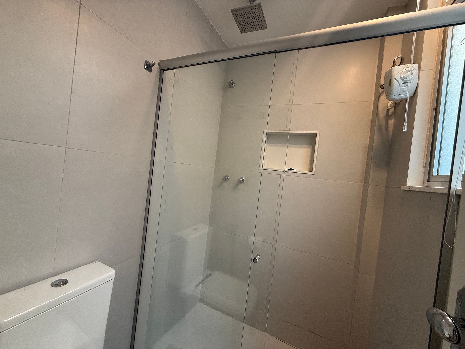 Baño: ducha de vidrio, ducha eléctrica y secador de pelo.
