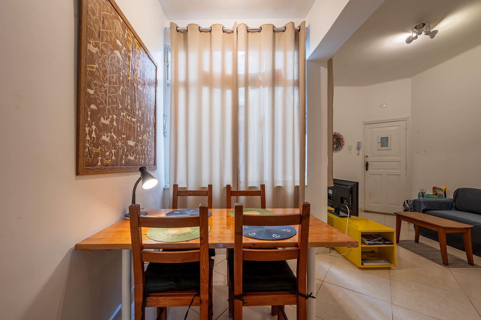 Apartamento cómodo con Smart TV, cocina con agua potable filtrada y habitación tranquila con persiana de madera.