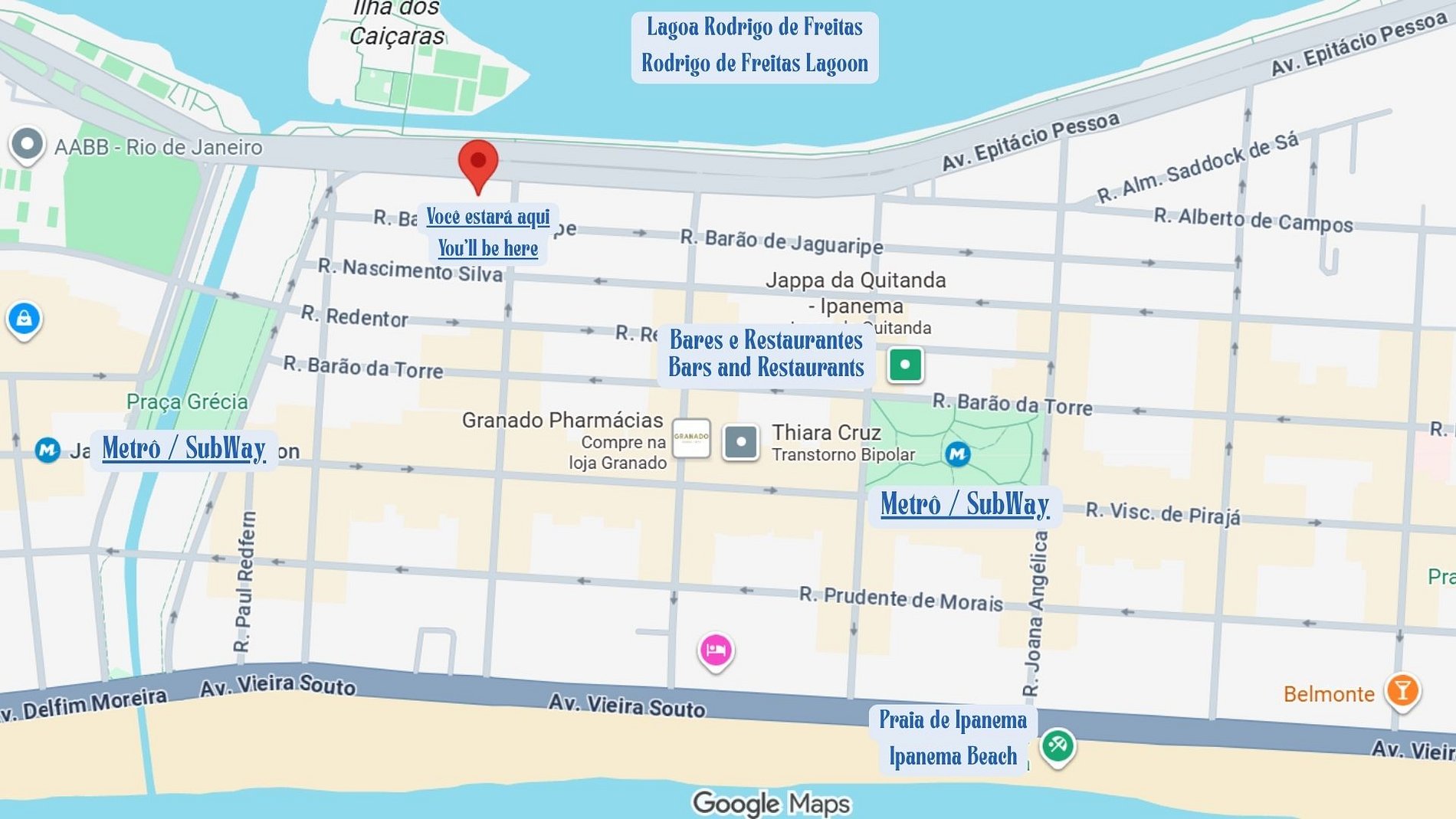 Ubicación privilegiada con vista a la Laguna y muy cerca (caminando) de la playa de Ipanema (Puesto 10). Estación de metro a 500 metros, los mejores restaurantes del barrio y el Shopping Leblon están cerca.