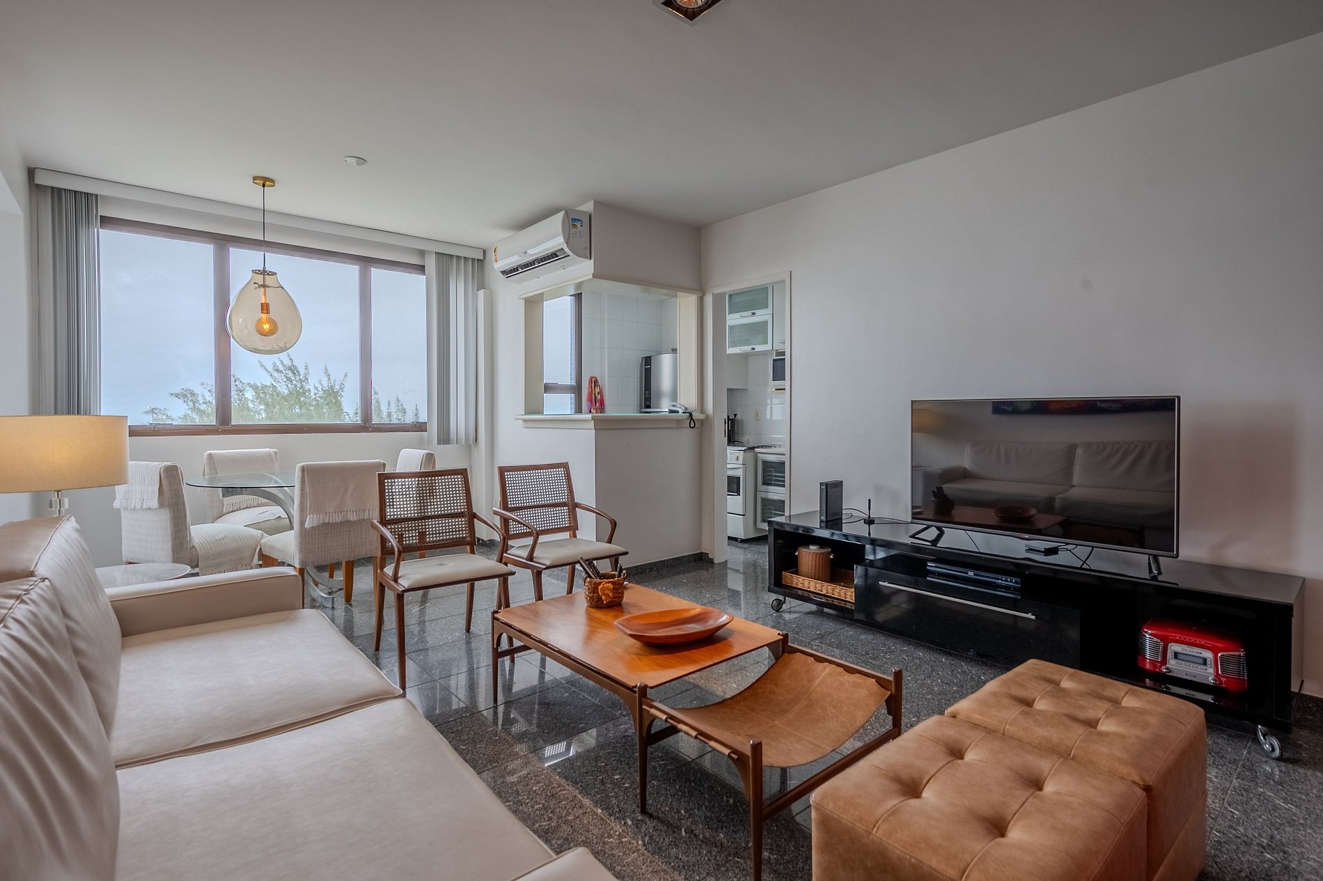 Amplio apartamento, balcón romántico con vista a la Playa de Barra, una hermosa suite con armario y dos dormitorios con cama matrimonial y aire acondicionado. Cómoda sala de estar con Smartv de más de 50 pulgadas, mesa de comedor para cuatro personas, cocina completa y dos baños. El edificio cuenta con estacionamiento disponible en el patio exterior, lavandería, jardín y recepción hasta las 21h.