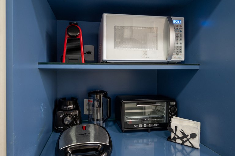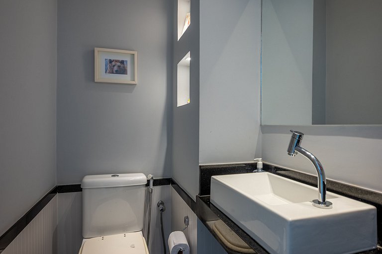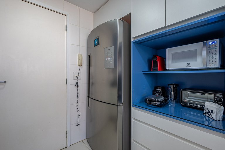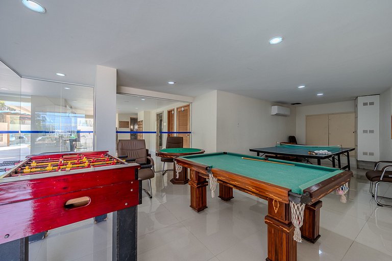 El edificio cuenta con: salón de juegos, gimnasio, parque infantil, sauna y piscina. Suite 1: cama queen Suite 2: cama doble + colchón individual. Ambas con aire acondicionado y armario. Baños con ducha, box de vidrio y secador. Cuna portátil y mesa de home office disponible. Cocina con refrigerador, horno, microondas, licuadora y utensilios. Lavadora y tendedero.