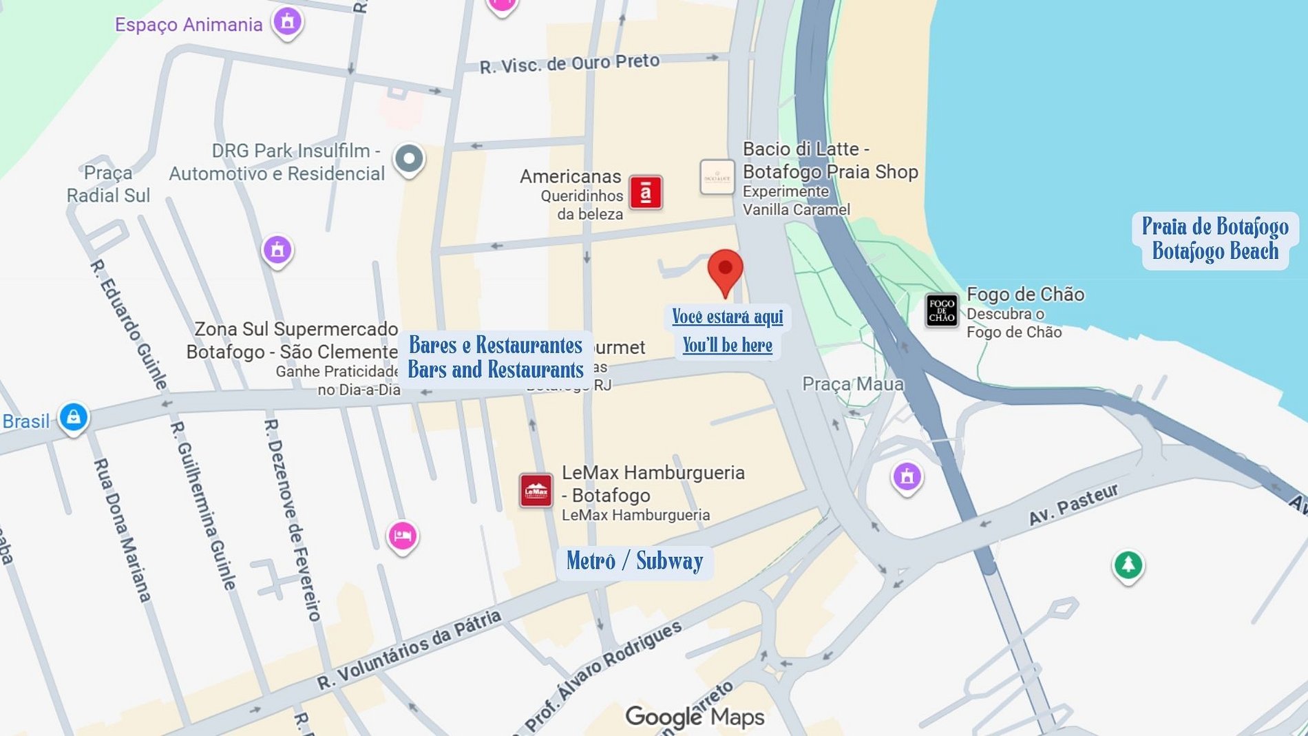El apartamento está en la cuadra del metro, al lado del centro comercial y de excelentes restaurantes, cines y bares. Botafogo es un barrio exclusivo de clase media alta en la Zona Sur de la ciudad de Río de Janeiro, con casi 100 mil habitantes, el barrio se caracteriza por albergar una de las principales postales del país: la Enseada de Botafogo, con las colinas del Pão de Açúcar. y Urca al fondo. Cuenta con cines, teatros, centros comerciales, discotecas, salas de conciertos, museos, centros de negocios, consulados, clínicas y hospitales.