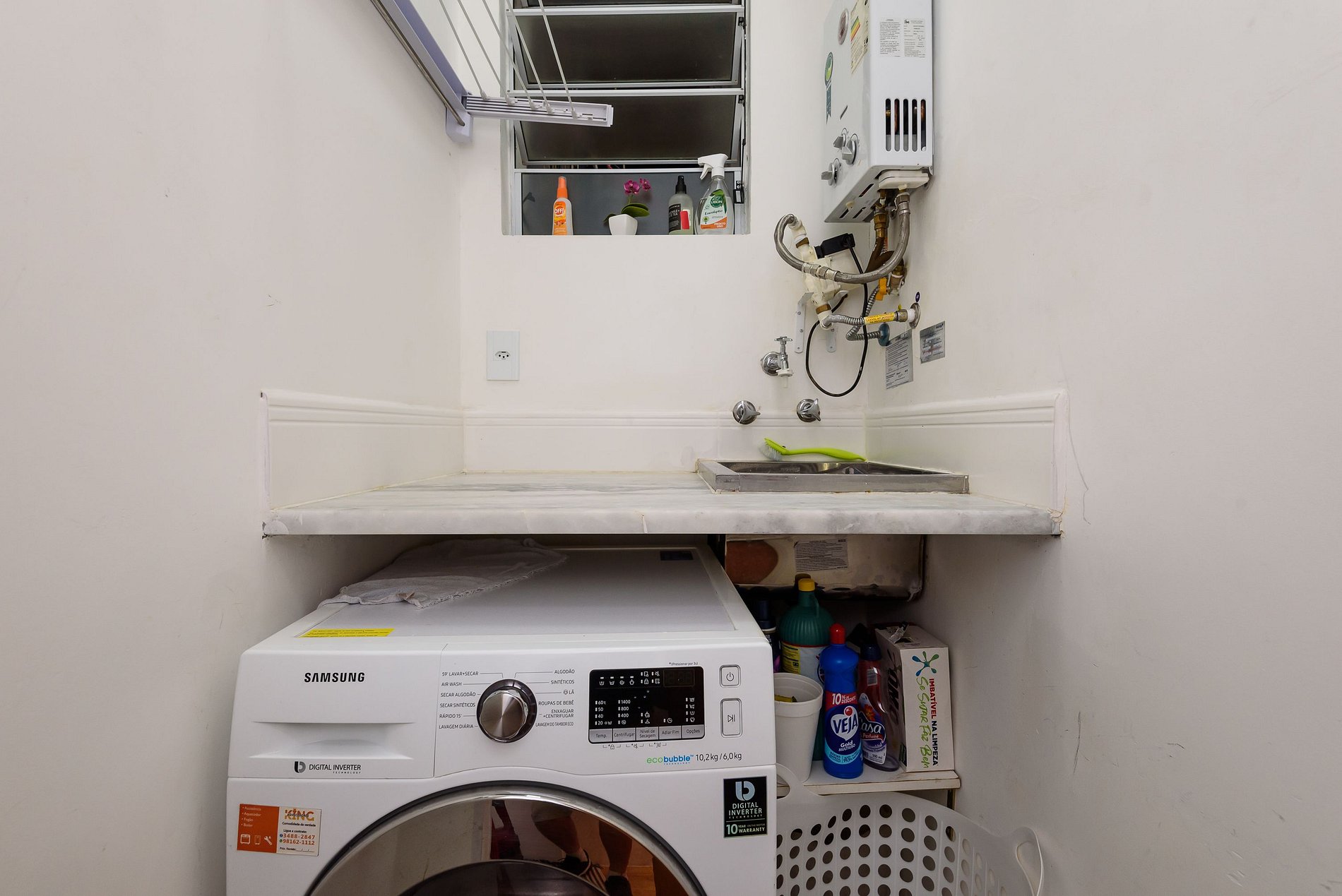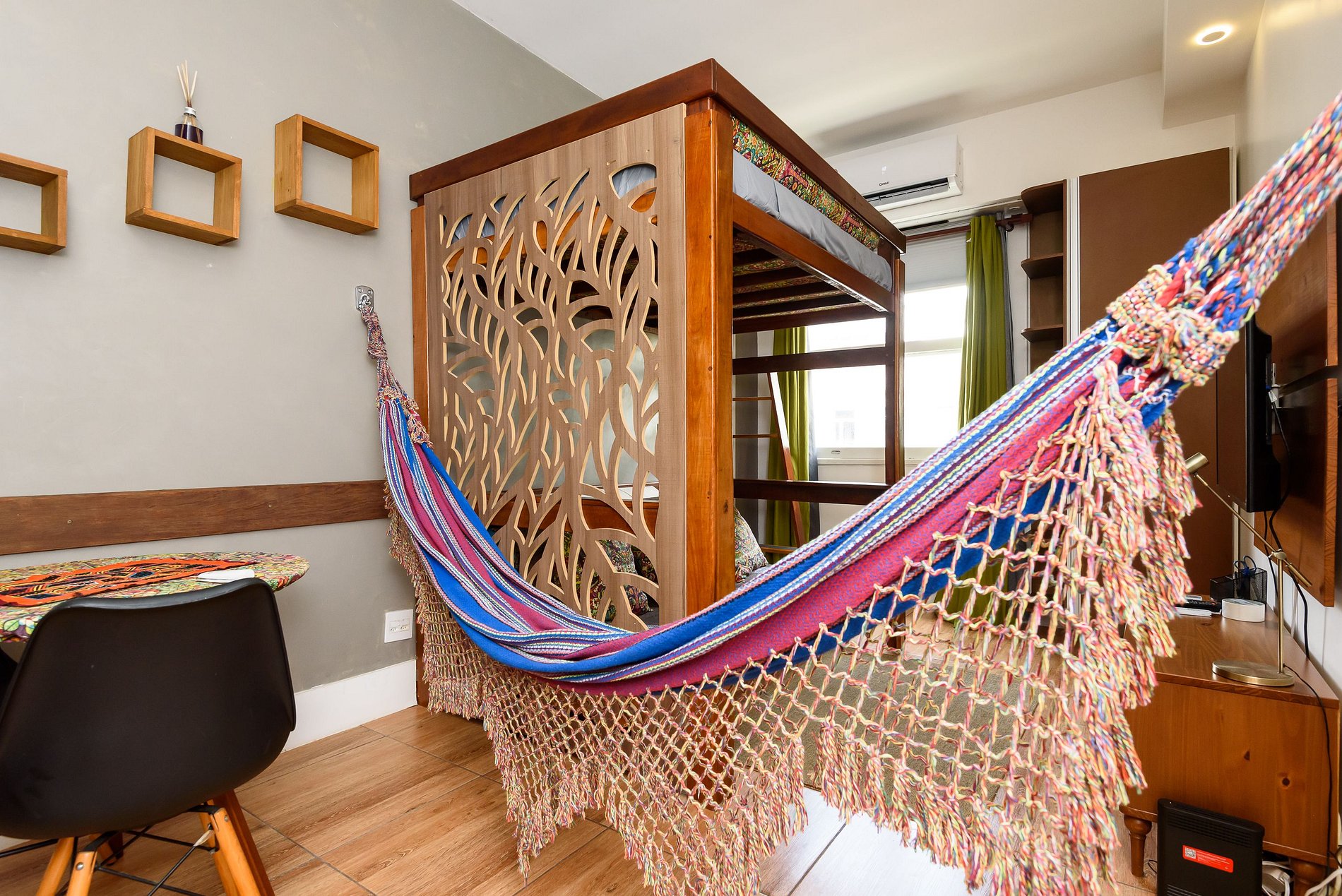 Incluso com TV smart, cama beliche com cama de casal em cima e sofá cama de casal em baixo e rede, cozinha compacta com mesa para refeições, banheiro aconchegante e uma pequena área de serviço com máquina lava e seca.