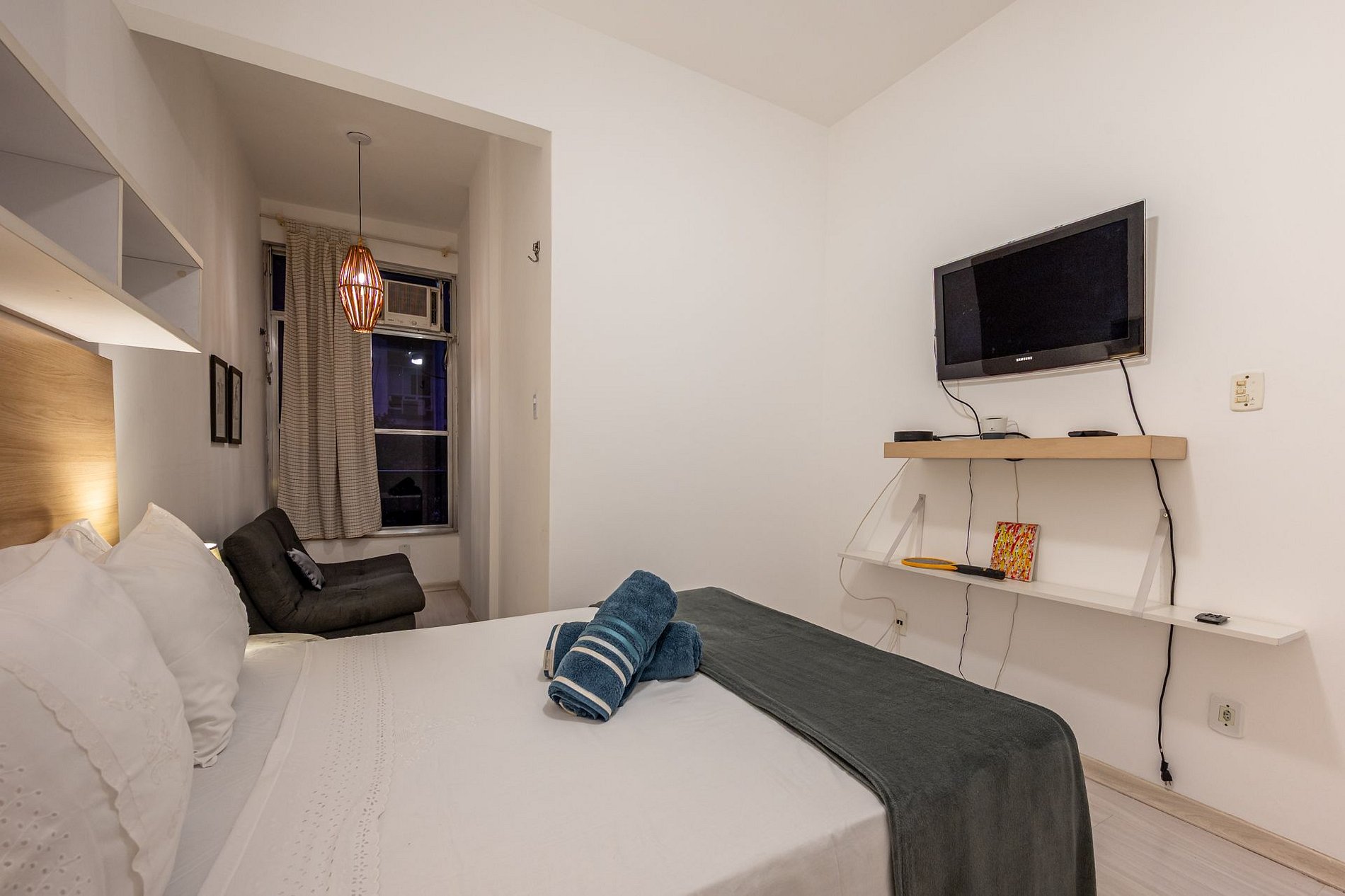 - Guarda-roupa amplo e os itens essenciais garantem comodidade durante toda a estadia.
