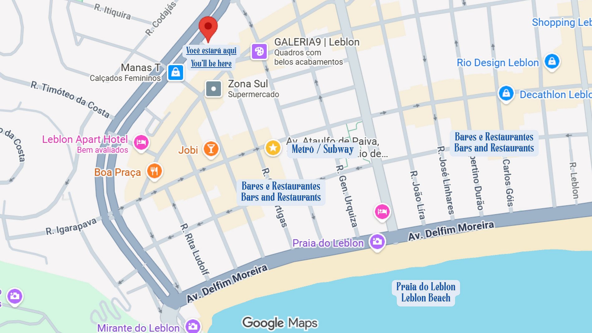 Localizado no melhor ponto do Leblon, na charmosa Rua General Artigas. A praia fica a poucos minutos a pé, assim como o Metrô e a famosa Rua Dias Ferreira, repleta de restaurantes, cafés, lojas e bares. Região segura, arborizada e perfeita para caminhadas. Próxima ao Shopping Leblon, ao Jardim de Alah e à Lagoa Rodrigo de Freitas.