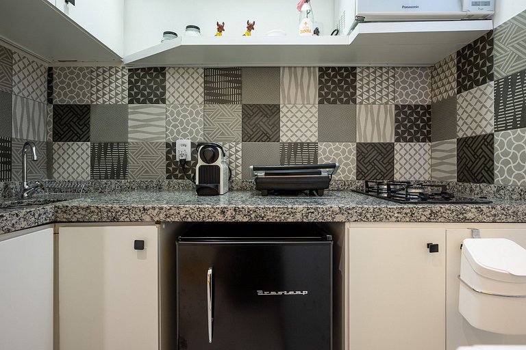 Studio decorado com pequena cozinha, banheiro, e amenidades necessárias para estadias confortáveis! Localizado a 5 minutos a pé da praia de Copacabana, 10 minutos da praia de ipanema e Arpoador. Ao lado de diversos restaurantes, bares, cafés e supermercados.