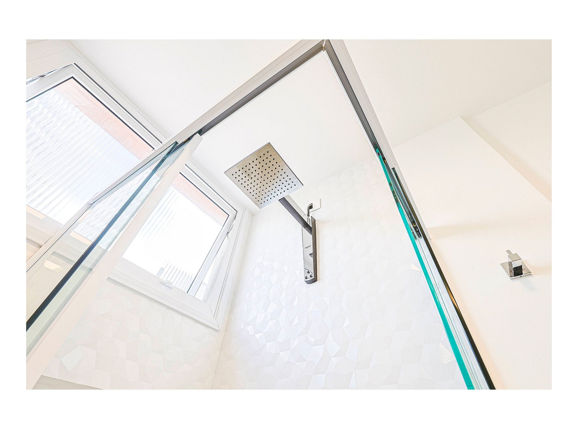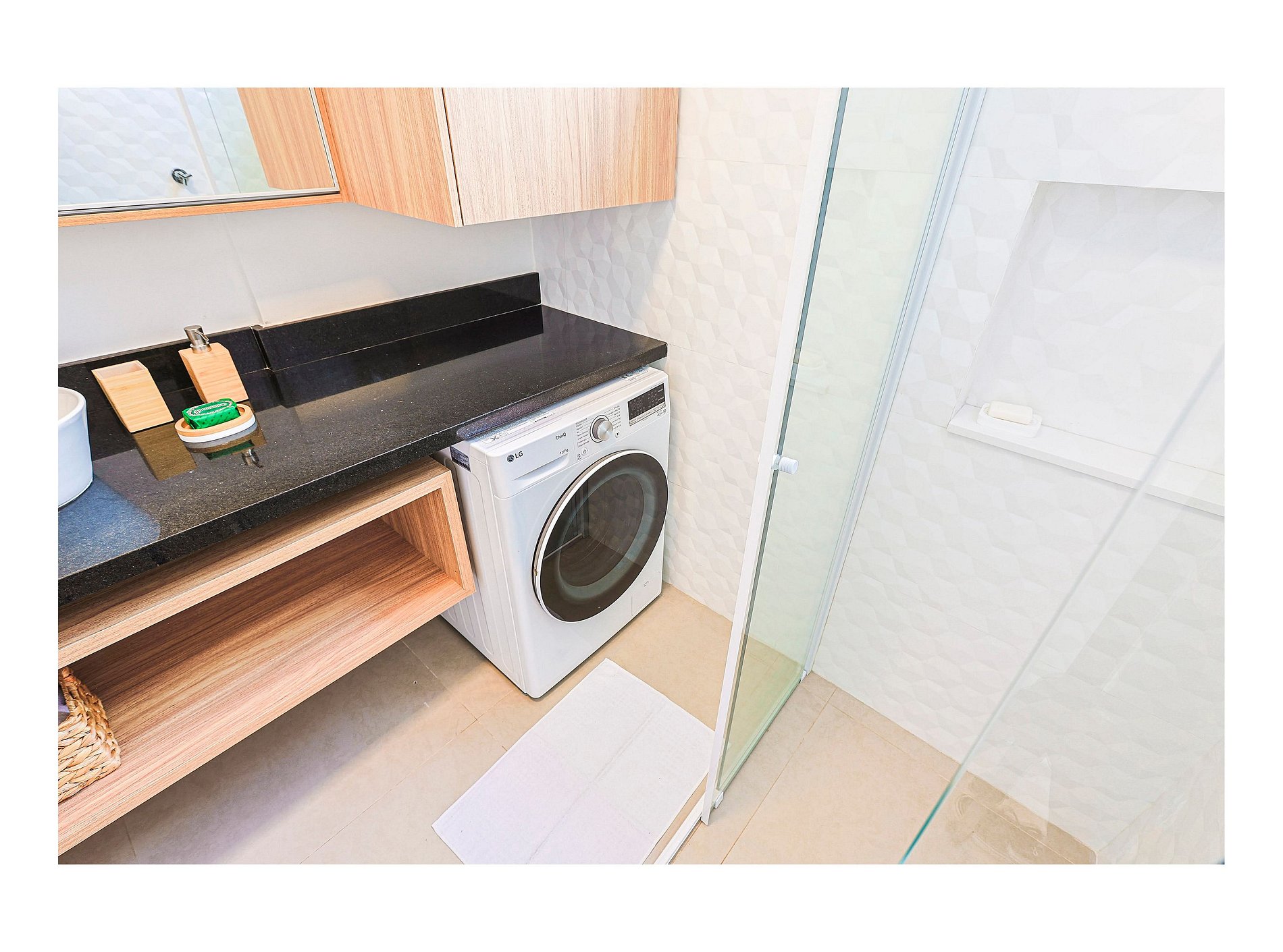 * Banheiro com box de vidro e chuveiro elétrico.