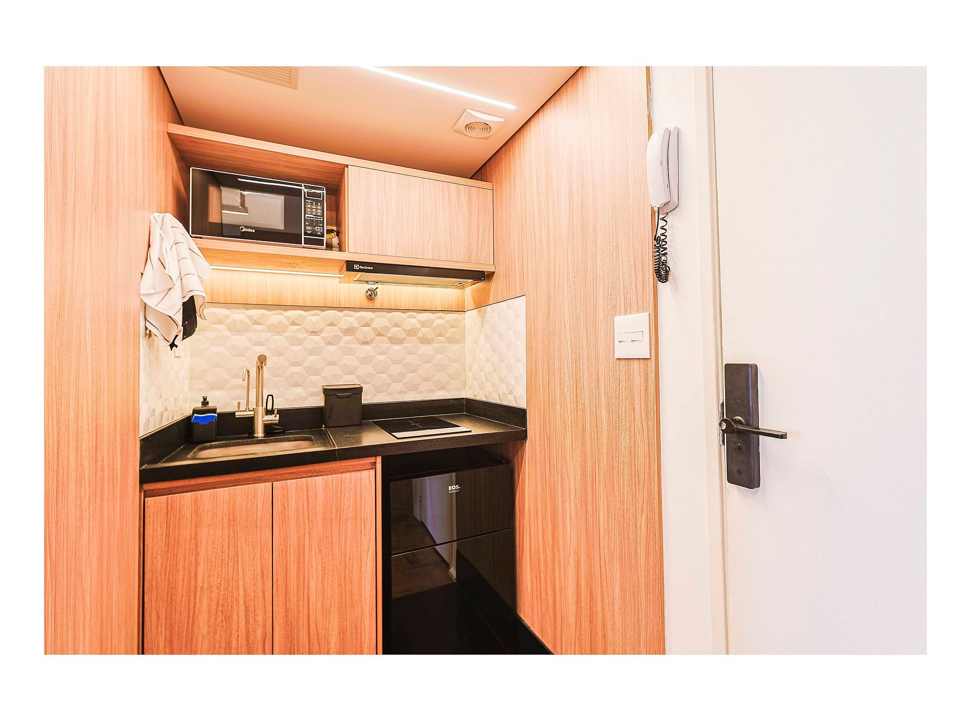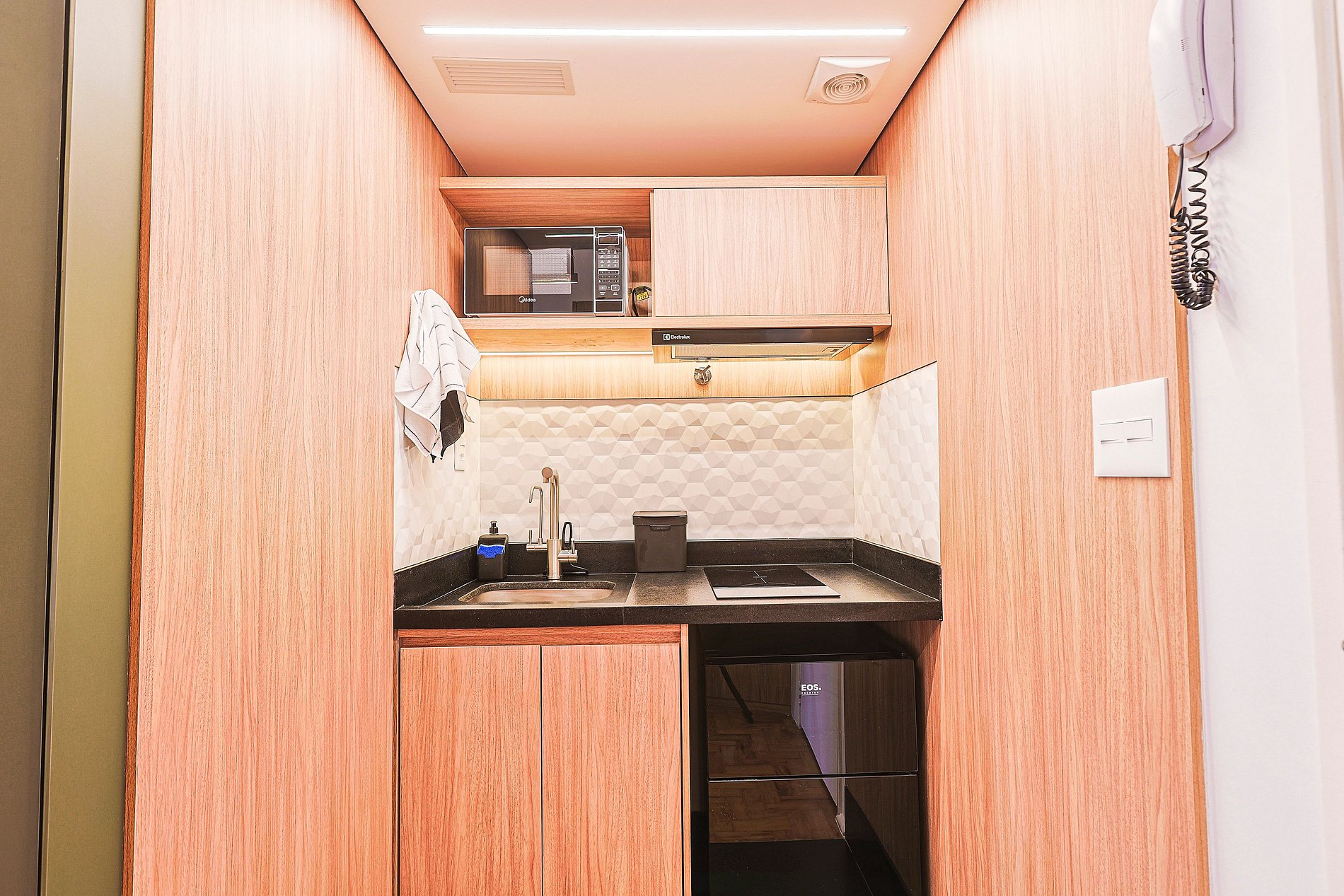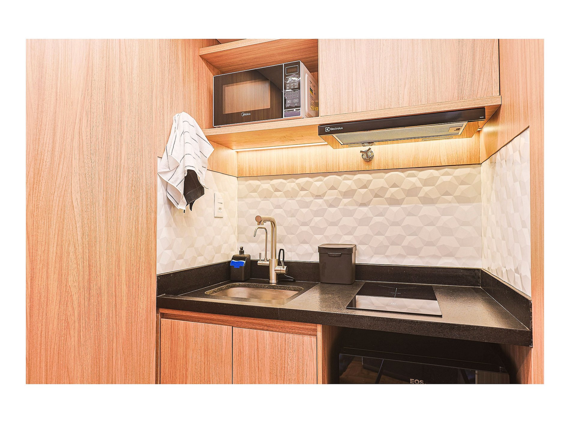 * Cozinha equipada com geladeira, cooktop, micro-ondas, liquidificador e utensílios básicos para preparo de refeições.