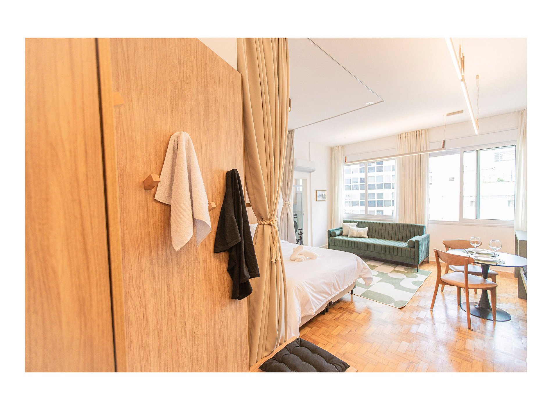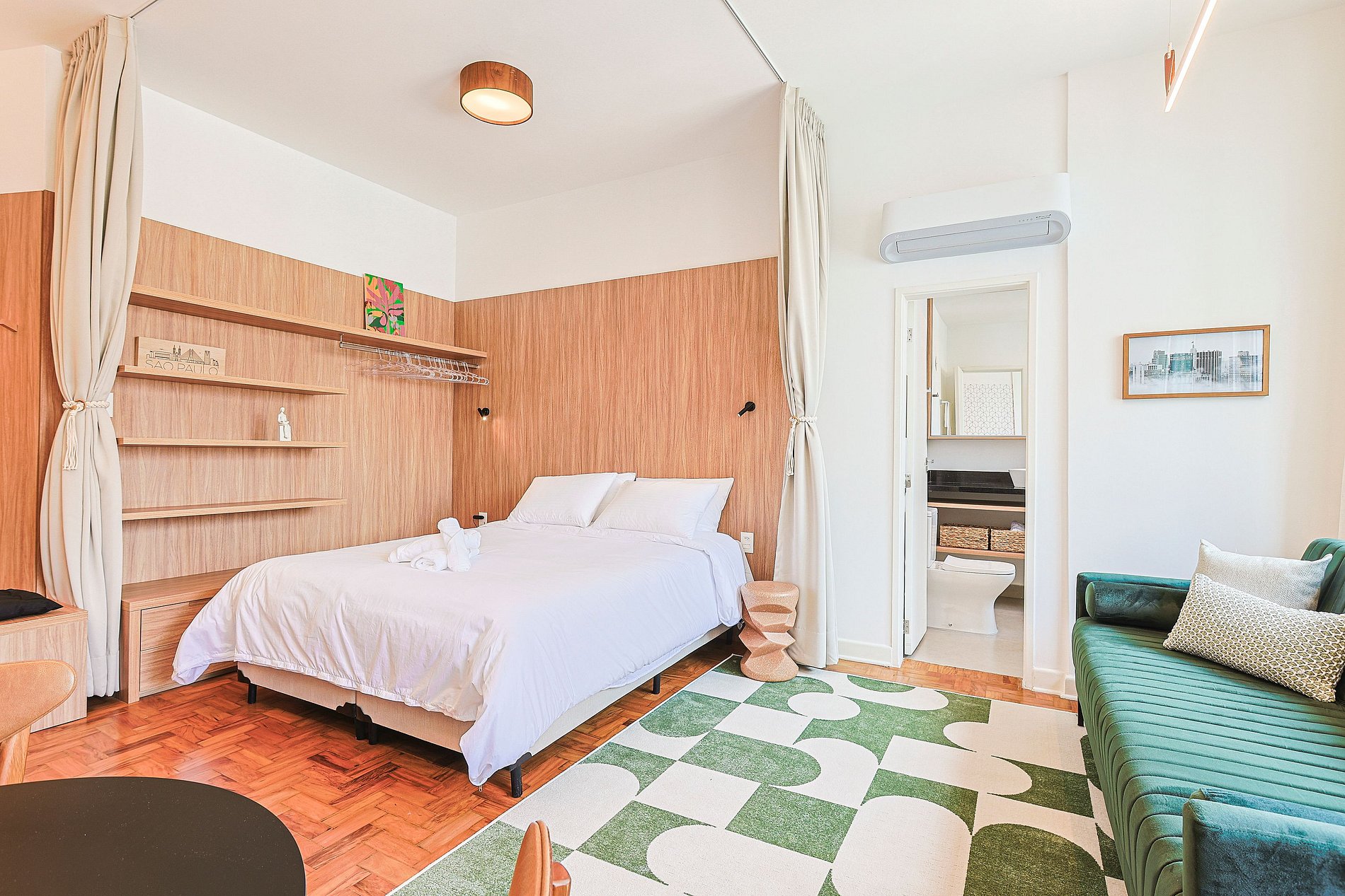 * Apartamento tipo estúdio com cama de casal e ambiente integrado.