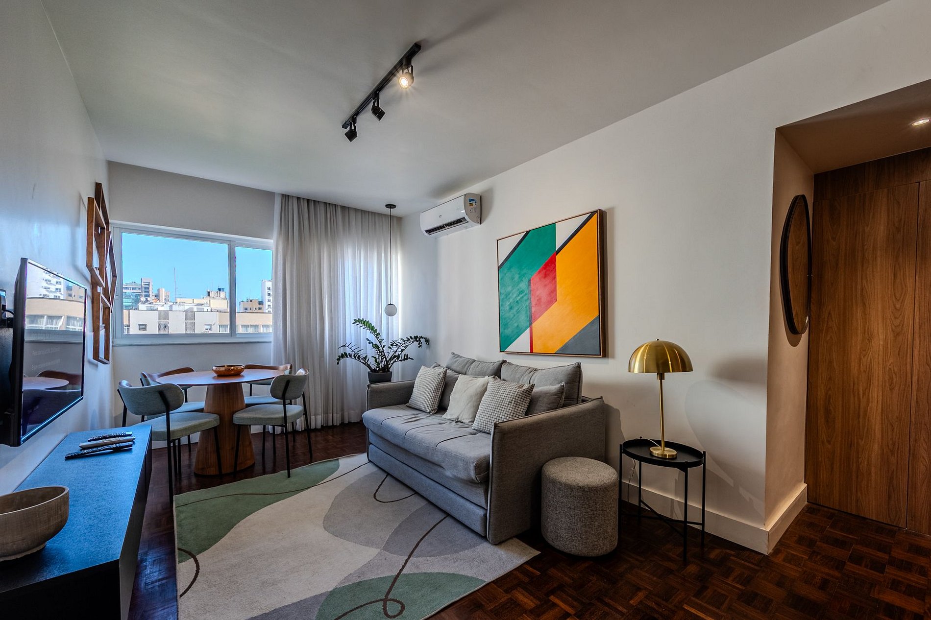 Sala aconchegante com sofá-cama, ar-condicionado e SmartTV