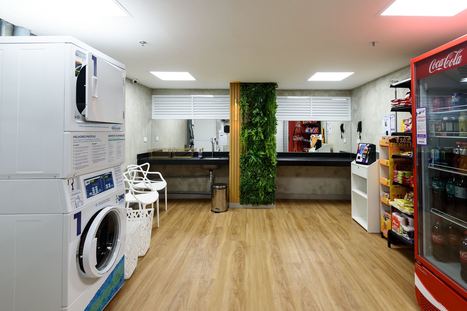 O condomínio possui serviço de arrumadeira diário e também conta com coffee-shop (faz entregas no apartamento), piscina em funcionamento, sauna, academia, lavanderia self-service, minimercado self-service com bebidas e snacks e uma vaga de garagem.