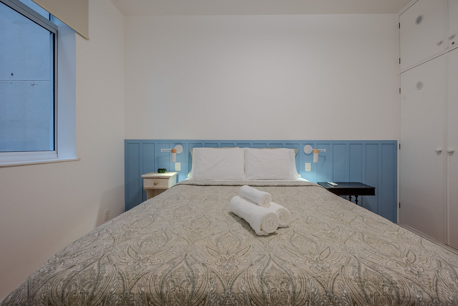 Apartamento mobiliado na Avenida Atlântica, rua da praia do Leme e Copacabana. Sala ampla, três quartos (dois com camas Queen, sendo um com suíte com banheiro, outro com working station e o terceiro com cama e sofá-cama de solteiro, uma cama de solteiro e uma mesa espaçosa de trabalho).