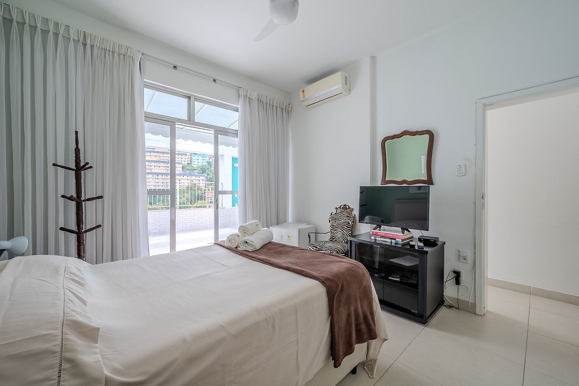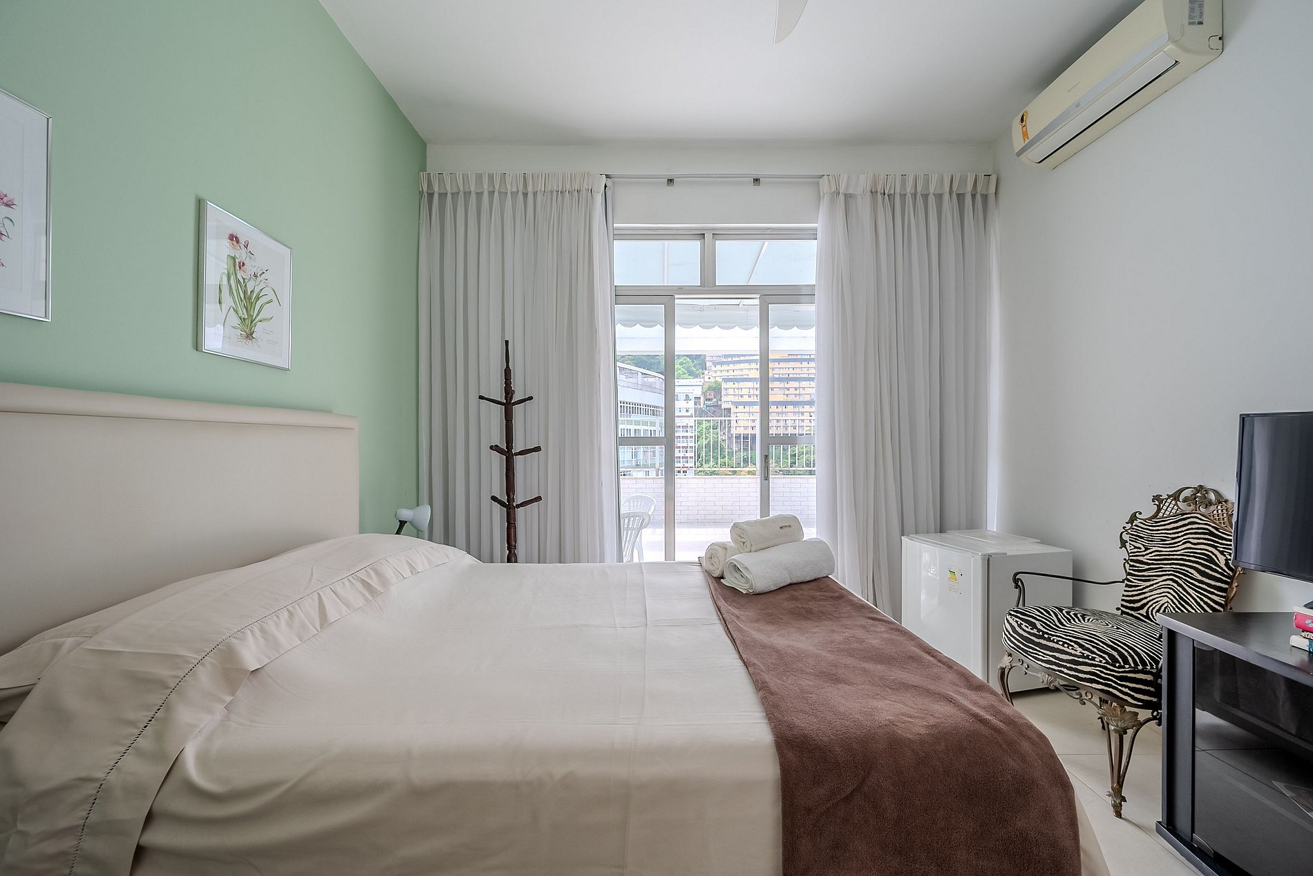 Quarto espaçoso em Ipanema, com cama de casal, ar condicionado, Wifi e banheiro privativo, o hóspede pode usar o terraço. Fica em Apartamento duplex, no apartamento moram mãe e filho. Para utilizar a vaga de garagem, paga-se 50 reais por dia, solicite com antecedência.