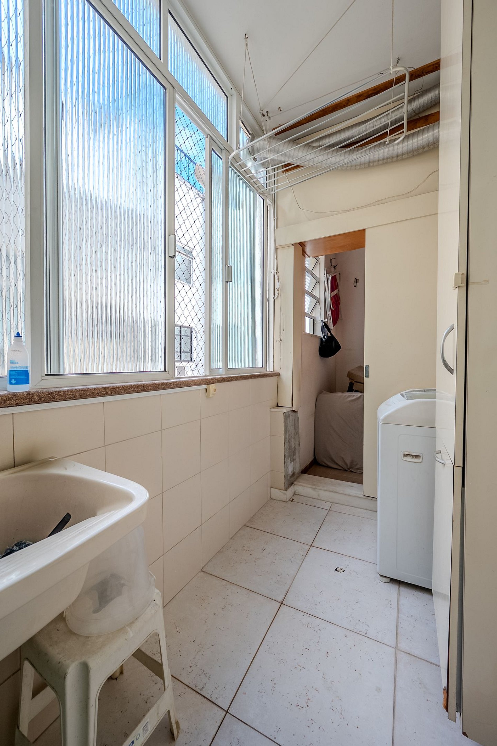 Há banheiro social e área de serviço arejada com máquina de lavar e espaço para secar roupas.