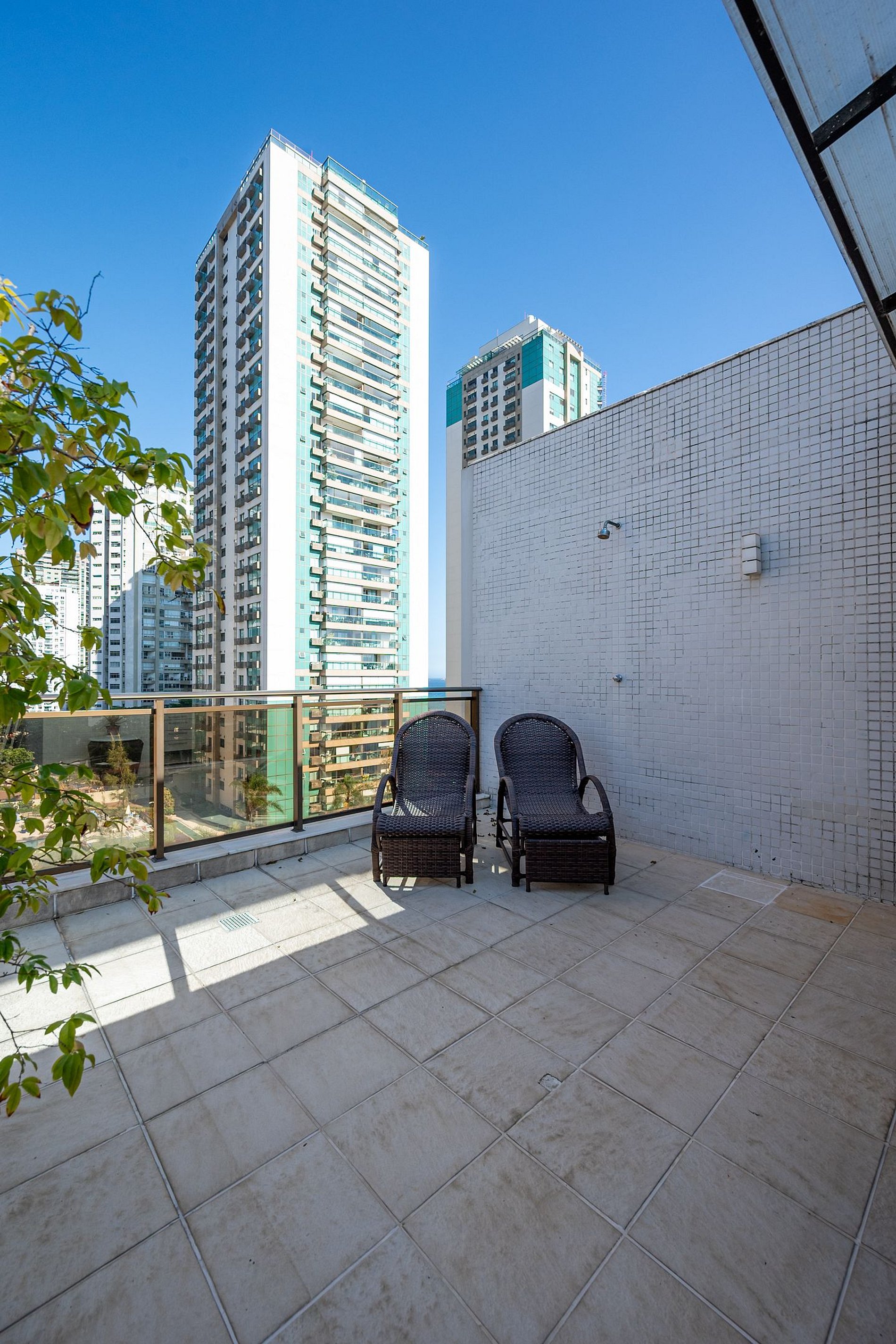 Apartamento possui terraço com cadeiras para relaxar e chuveiro externo, uma confortável suíte, dois quartos com cama de casal, ampla sala em conceito aberto, mesa com 4 lugares, TV de até 55”, wi-fi de alta velocidade, ar condicionado, cozinha completa, máquina de lavar e um banheiro social.