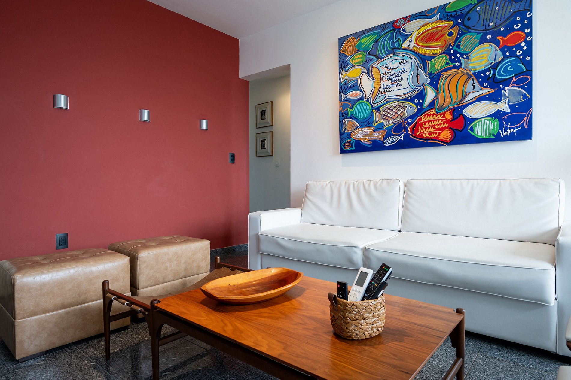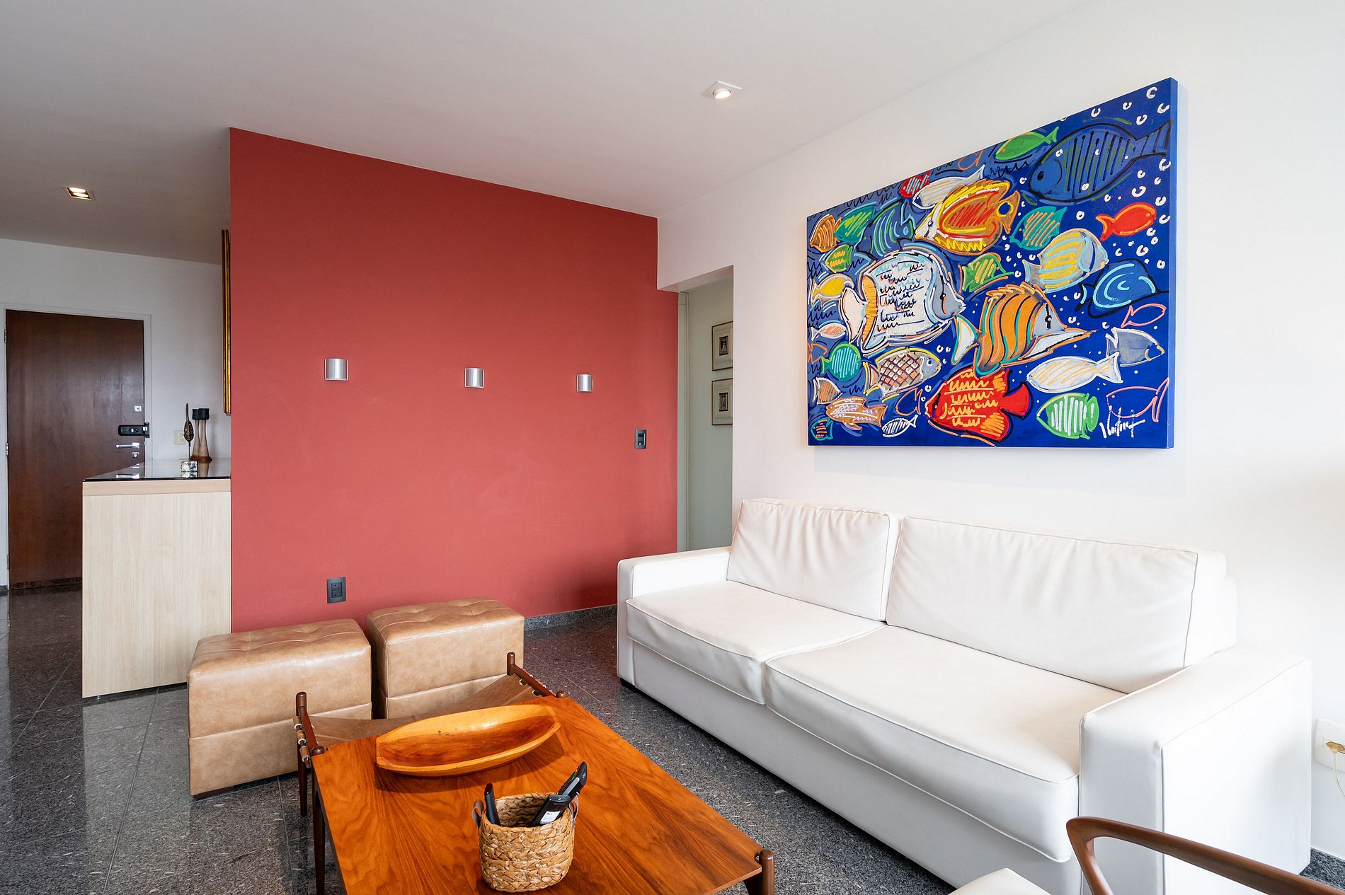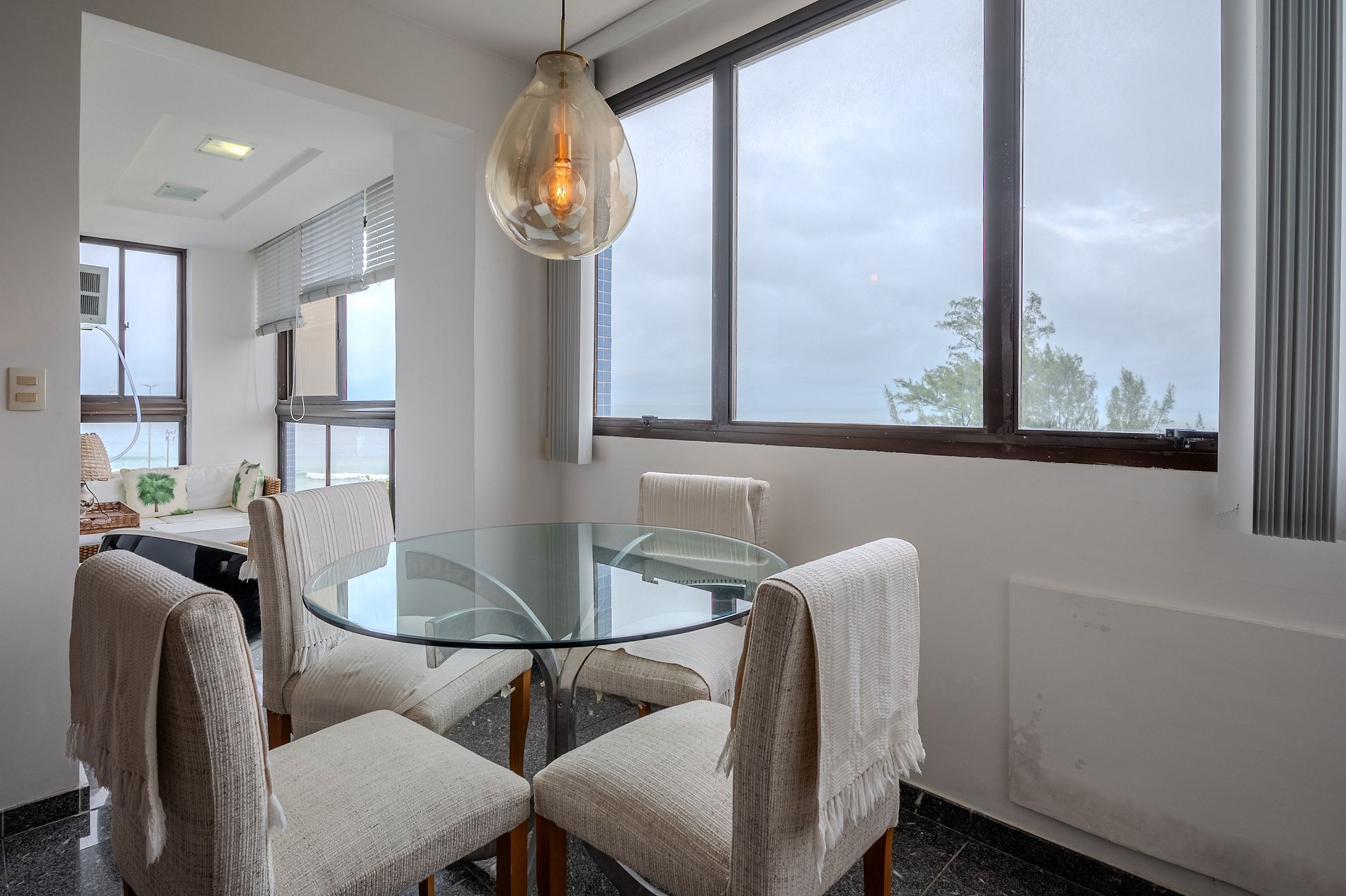 Amplo apartamento, varanda romântica com vista para praia da barra, uma bela suíte com armário e dois quartos com cama de casal e ar condicionado, confortável sala de estar, Smartv maior que 50", com mesa de jantar de quatro lugares, cozinha completa e dois banheiros.