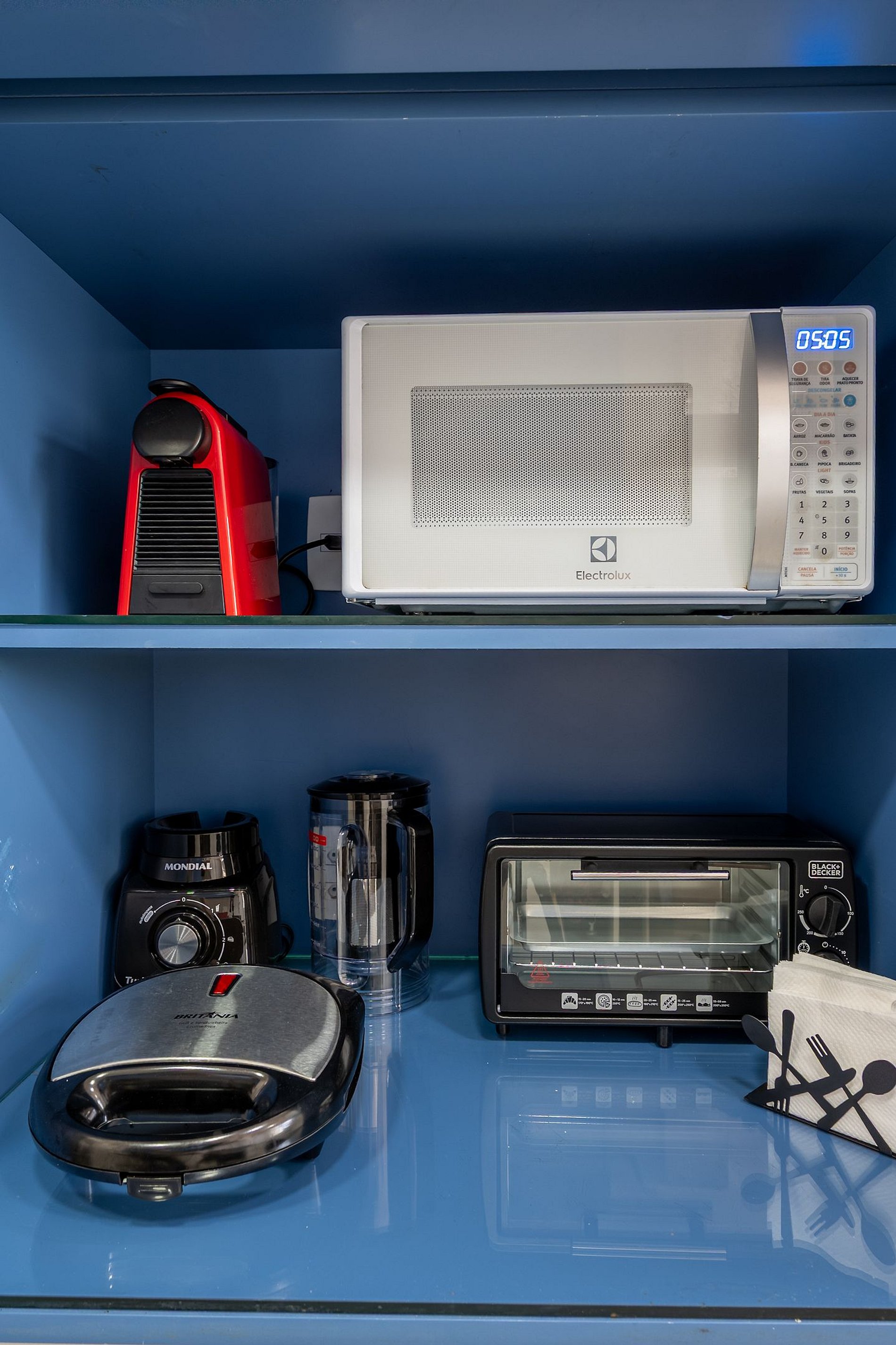 Cozinha equipada com geladeira, fogão, forno, micro-ondas, liquidificador e utensílios.