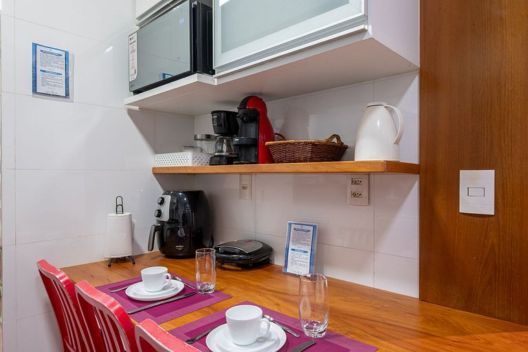 El apartamento es muy amplio, muy bien equipado: 5 aires acondicionados, secador de cabell potente, 3 televisores smart de buen tamaño y calidad. La cocina cuenta con una heladera espectacular, anafe y horno eléctrico, microondas y tres tipos de cafeteras (filtrado, electrica, de capsulas tipo dolce gosto). Muy bueno contar con filtro de agua portabilizadora.
