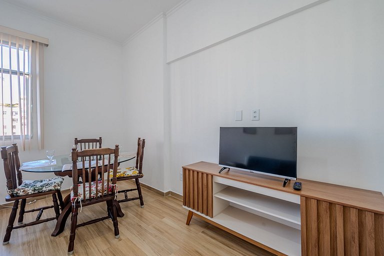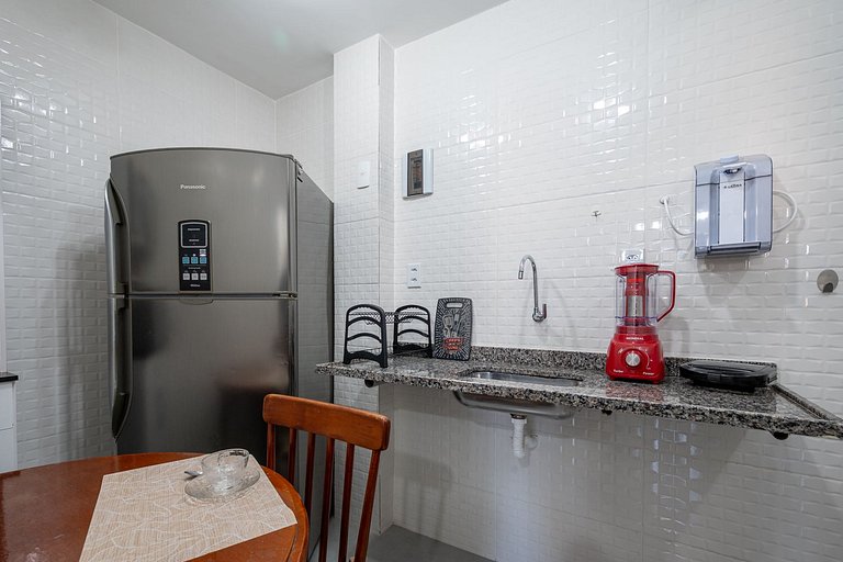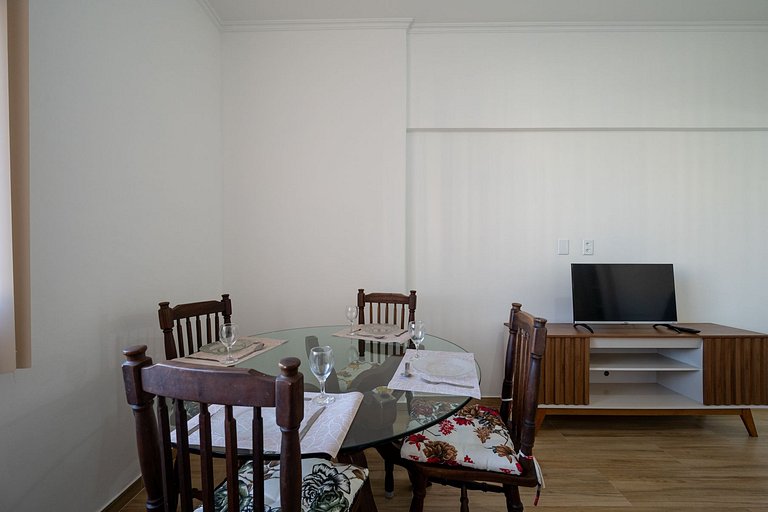 Além de bem localizado, o apartamento de 1 quarto tem uma cama de casal, armários, sala de estar com sofá, mesa de jantar, TV, wi-fi, cozinha completamente equipada com filtro d'água.