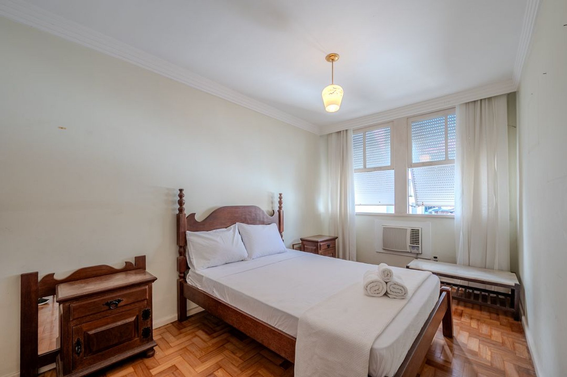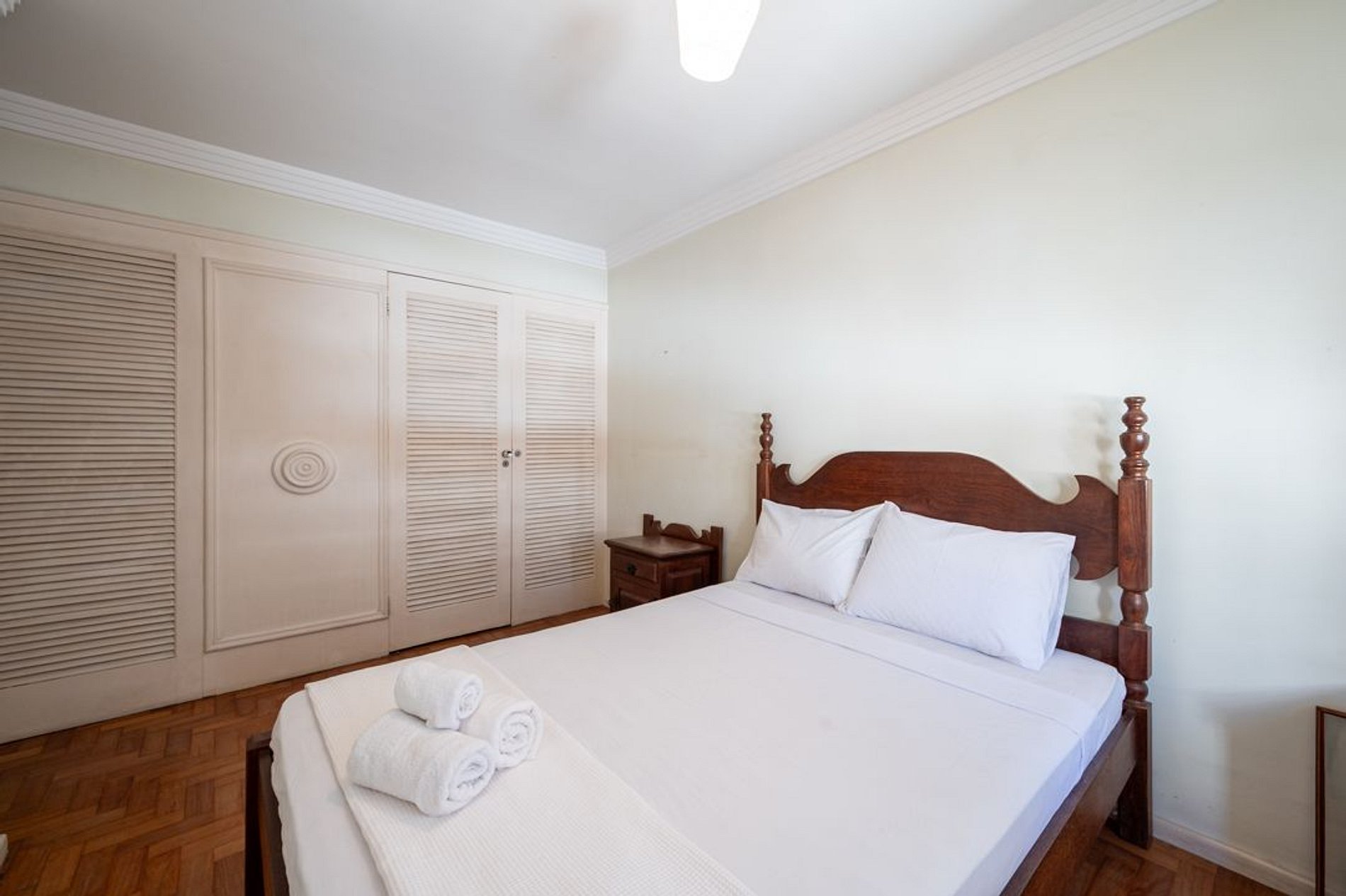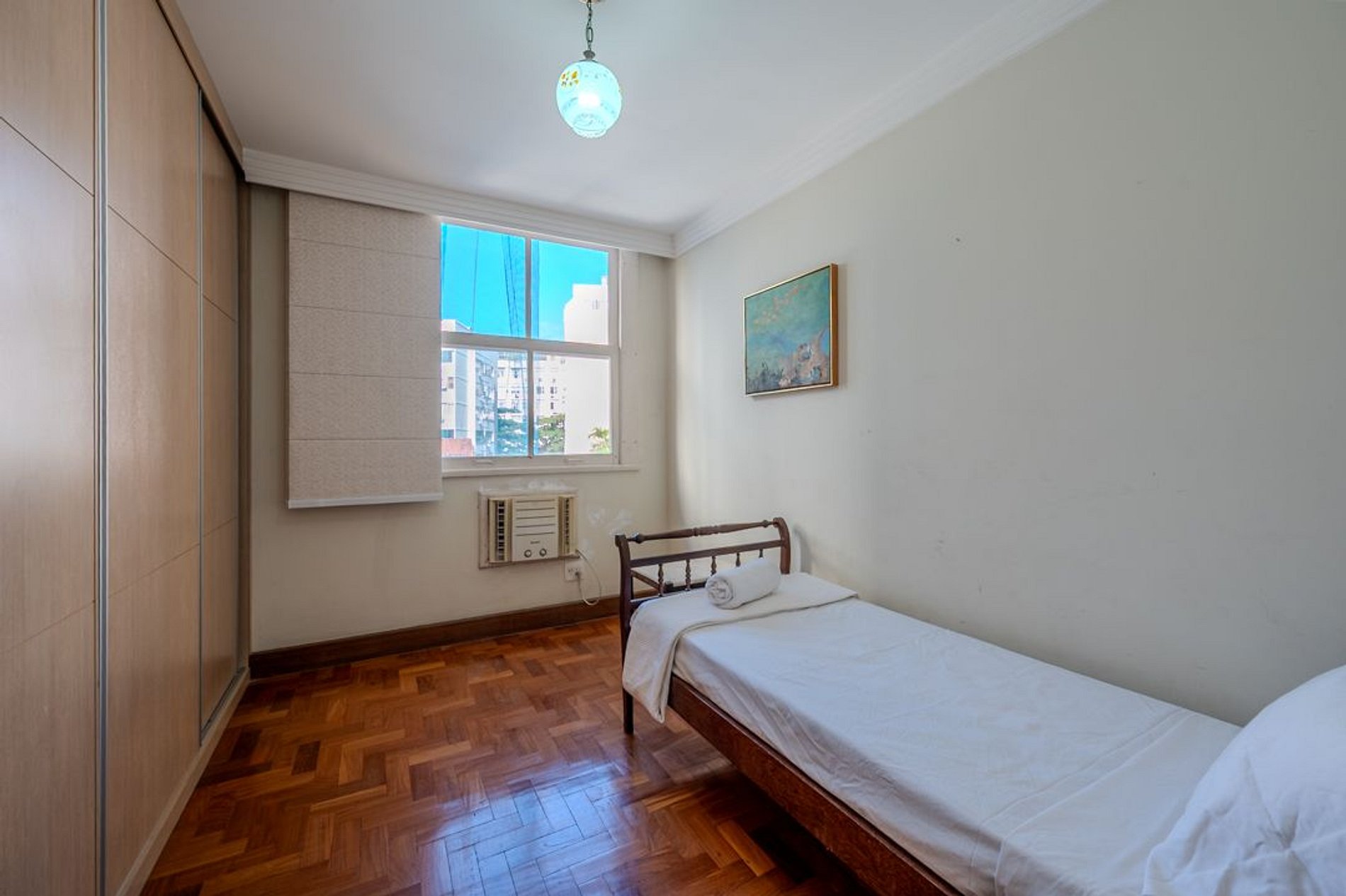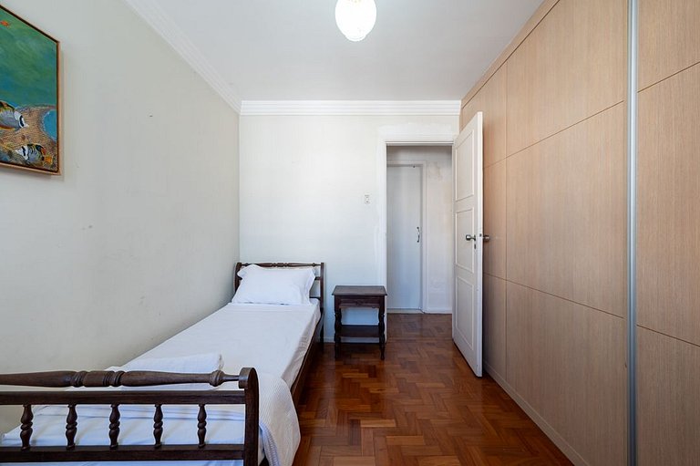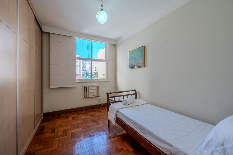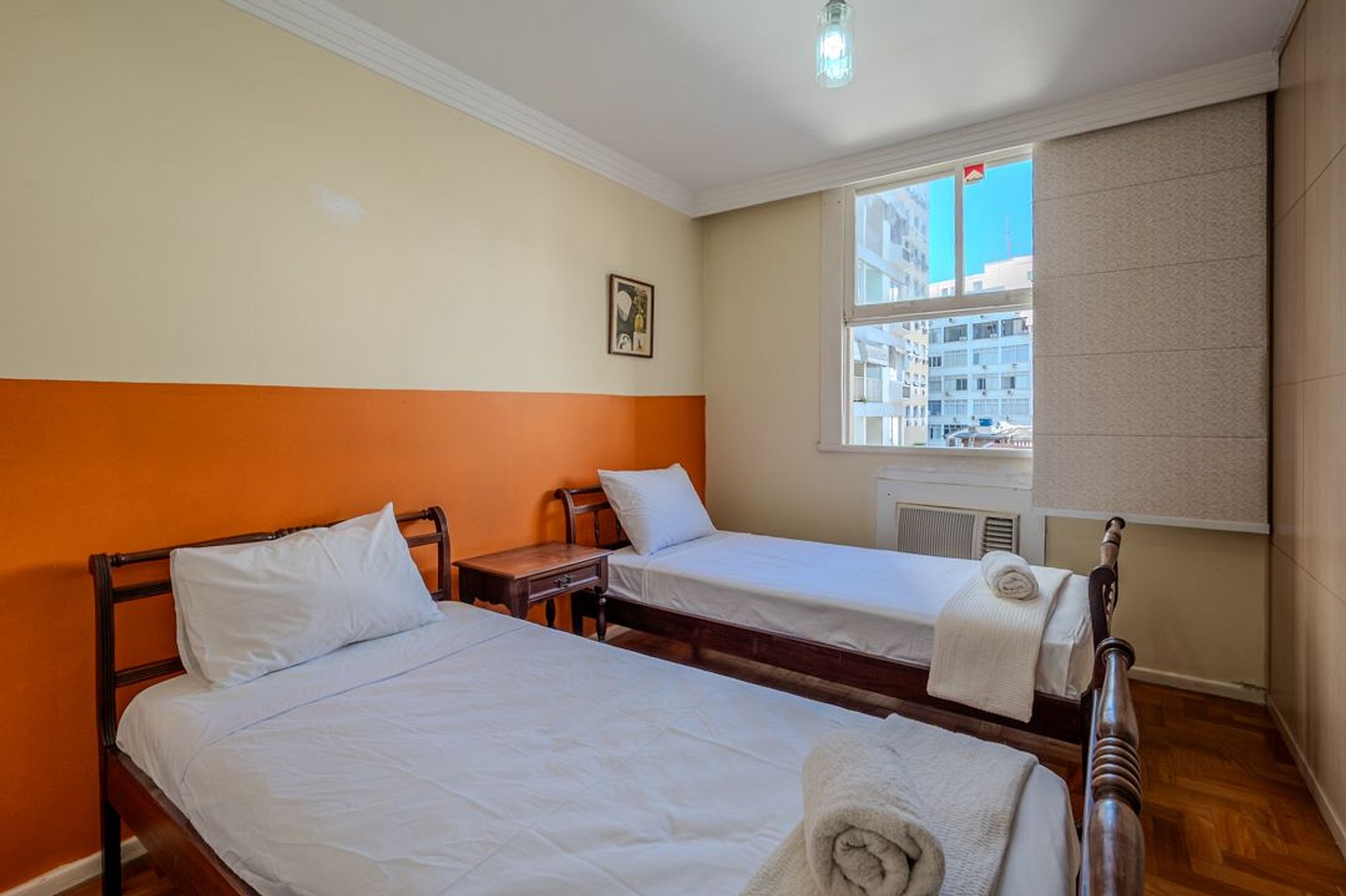 Apartamento com 3 quartos em Ipanema, sendo 1 suíte com cama de casal, 1 com uma cama de solteiro e outro com duas camas de solteiro, todos com ar condicionados. Há um quarto de dependência com uma cama de solteiro que também pode ser usado, mas não há ar-condicionado.