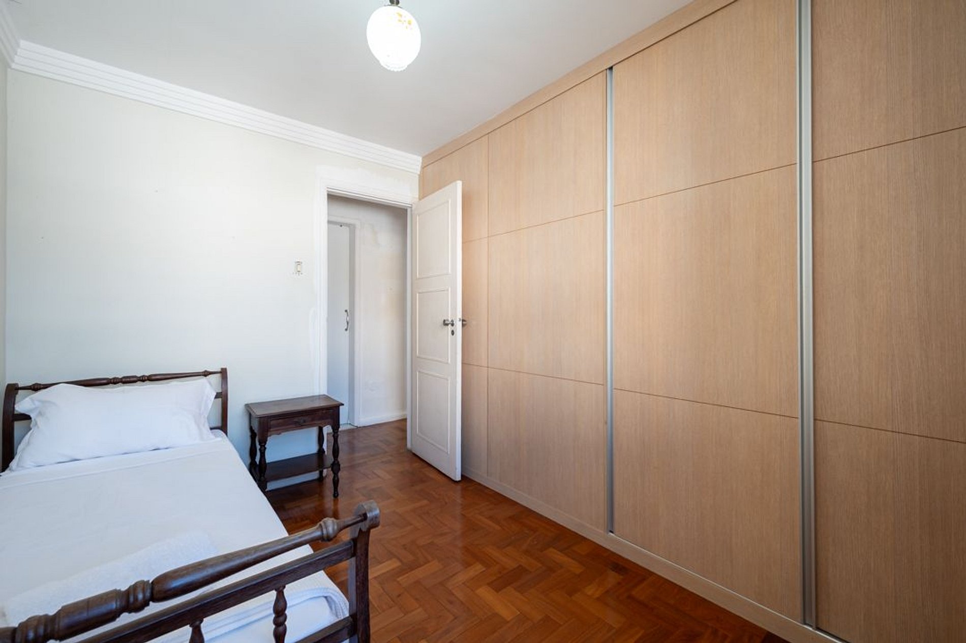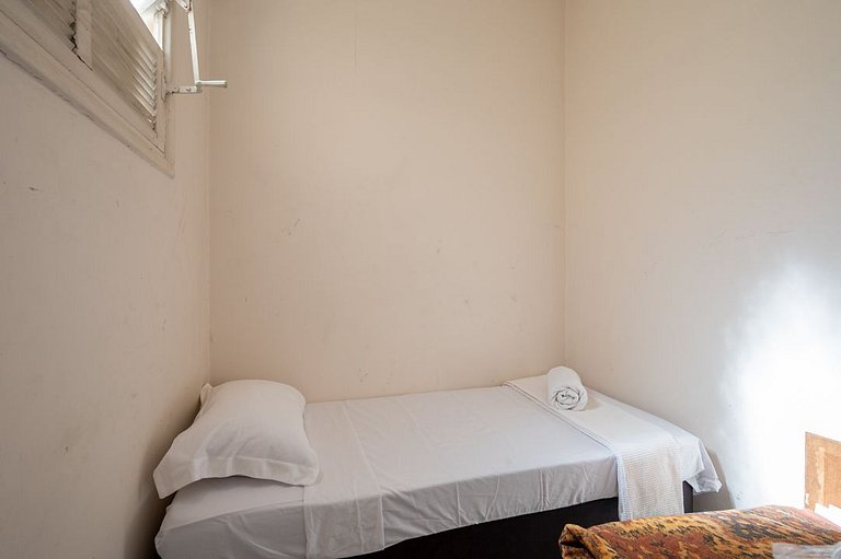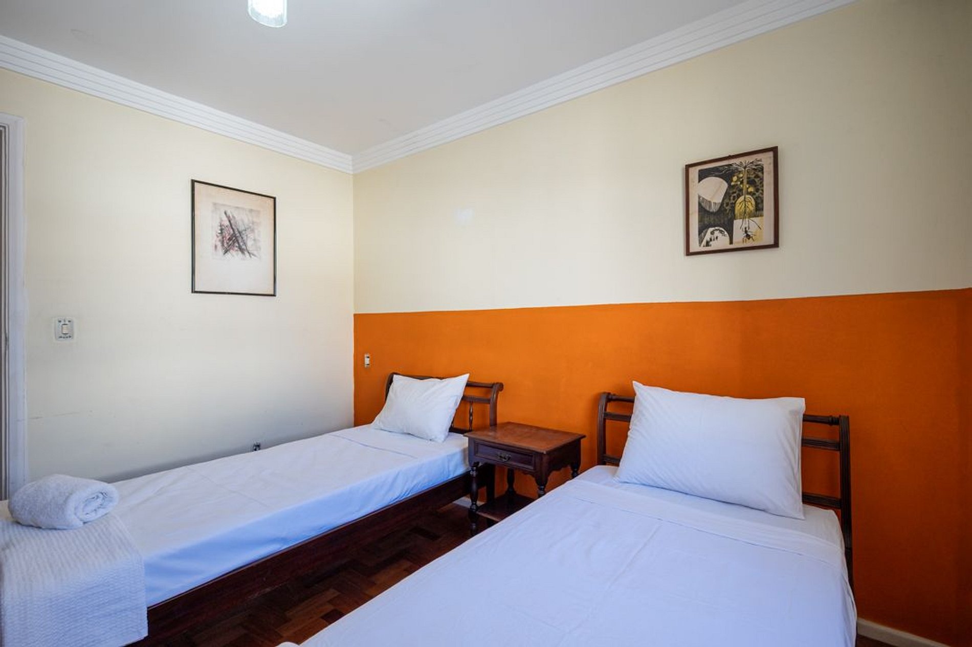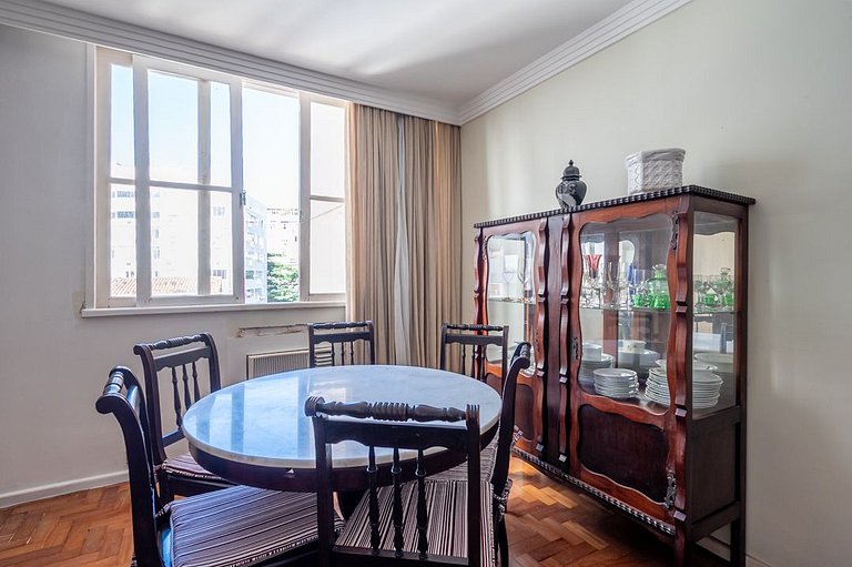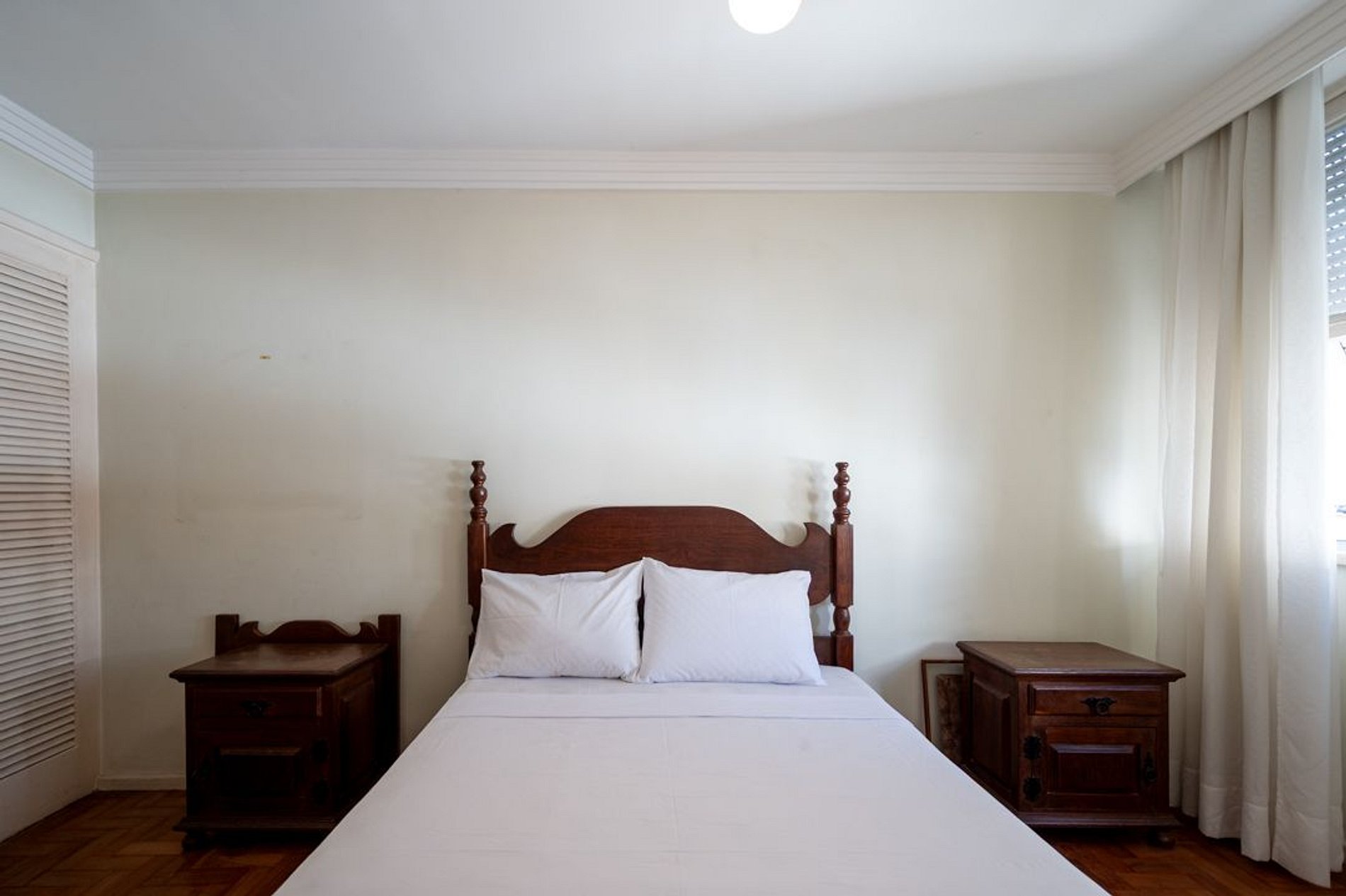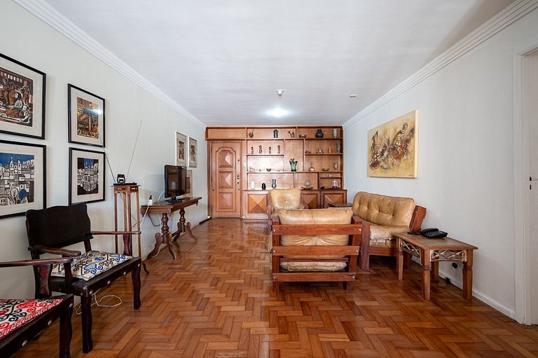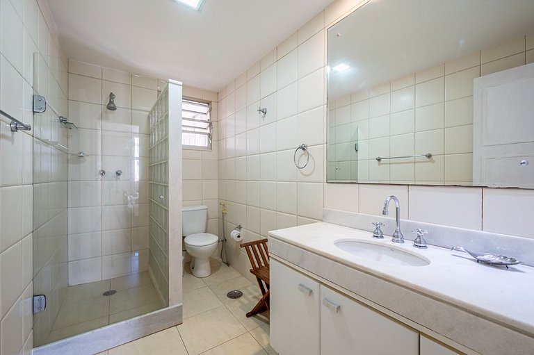 Apartamento com 3 quartos em Ipanema, sendo 1 suíte com cama de casal, 1 com uma cama de solteiro e outro com duas camas de solteiro, todos com ar condicionados. Há um quarto de dependência com uma cama de solteiro que também pode ser usado, mas não há ar-condicionado.