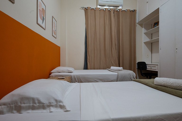 Umas das melhores estadias que fiquei no Rio de Janeiro , a localização é um diferencial , tem tudo o que voce precisa no quarteirao , é 3 minutos ate a praia . Embaixo do apartamento tem dois restaurantes que da pra fazer todas refeições o ZigZag é minha recomendação . Referente ao interior do apartamento , ele é otimo , fomos em um grupo de 6 pessoas e tivemos conforto , unico ponto , é a questao de ter dois banheiros mas somente um é com chuveiro, o outro é lavabo , mas nao foi um problema . A cozinha é equipada com o necessario , a sala é espaçosa com sofa , tv e mesa de jantar . Os quartos tem ar condicionados novos , que são excelentes . O quarto de solteiro nao tem ar , mas tem uma janela grande e um ventilador de teto . Recomendo a hospedagem para grupos de amigos e familias . Vale destacar que familia com idosos o box do banheiro tem uma "paredinha" que é necessario levantar a perna para entrar , podendo nao ser bom para esse publico que tenha limitações . Voltarei